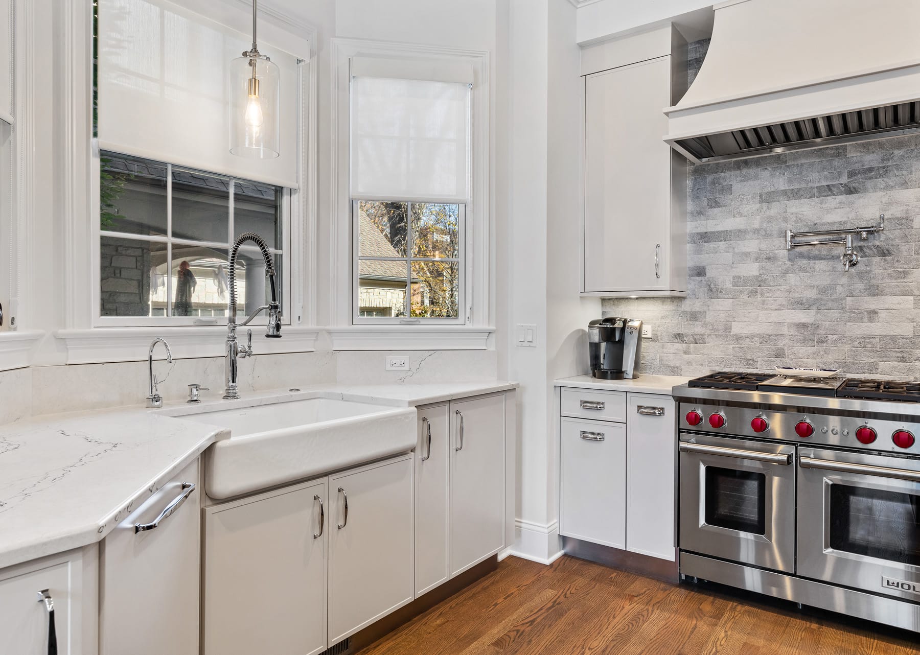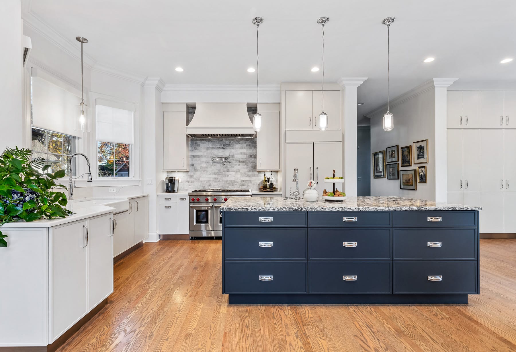 Enhance this Hinsdale home’s spaces to match the homeowners’ culinary aspirations as professional chefs. The aim was to enlarge the kitchen with a functional cook’s range area and island and recreate a less crowded kitchen dining area with more natural light and views to the rear yard. Lastly, we wanted more pantry space and a coffee center for more barista style brewing and preparation area.