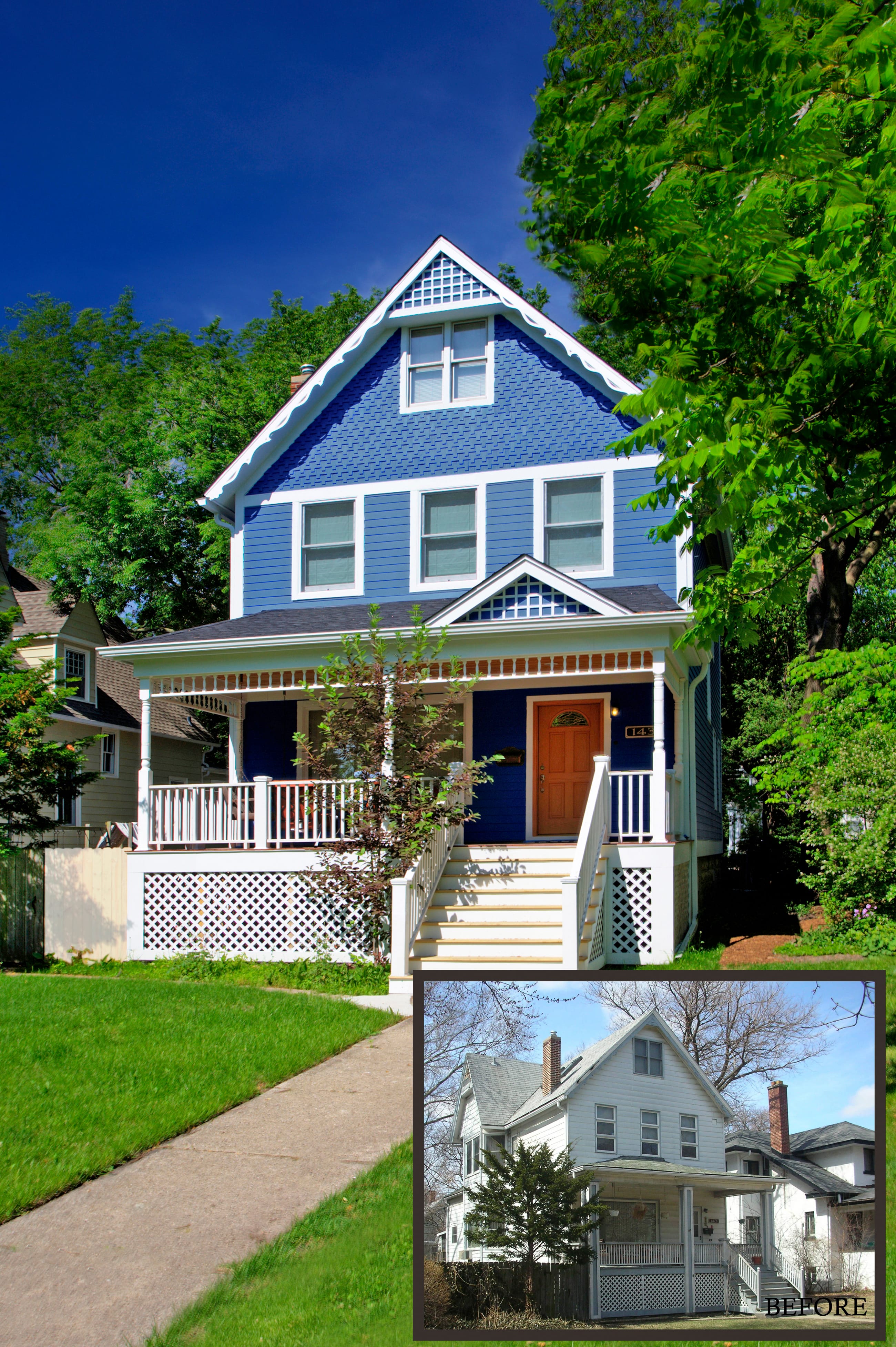 To bring the client’s vision to life, the exterior remodel project embraced a fusion of classic and modern elements. The vibrant blue exterior revitalized the traditional color palette, infusing the residence with a new energy. The covered porch was meticulously designed to feature intricate woodwork and cozy furnishings, creating an outdoor oasis that perfectly complemented the Victorian charm of the home.