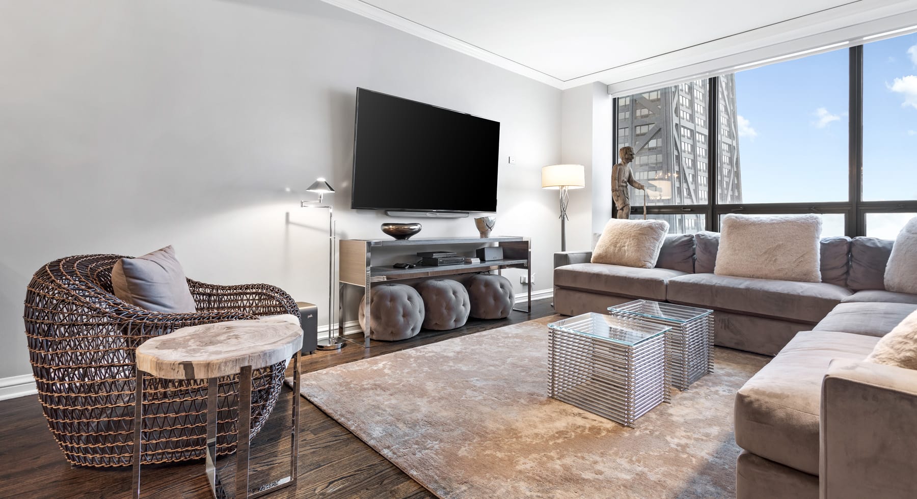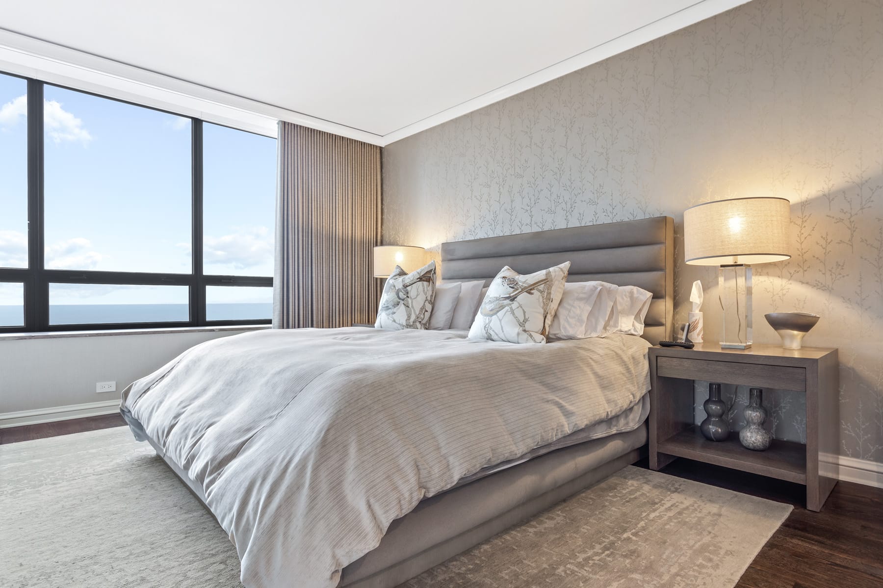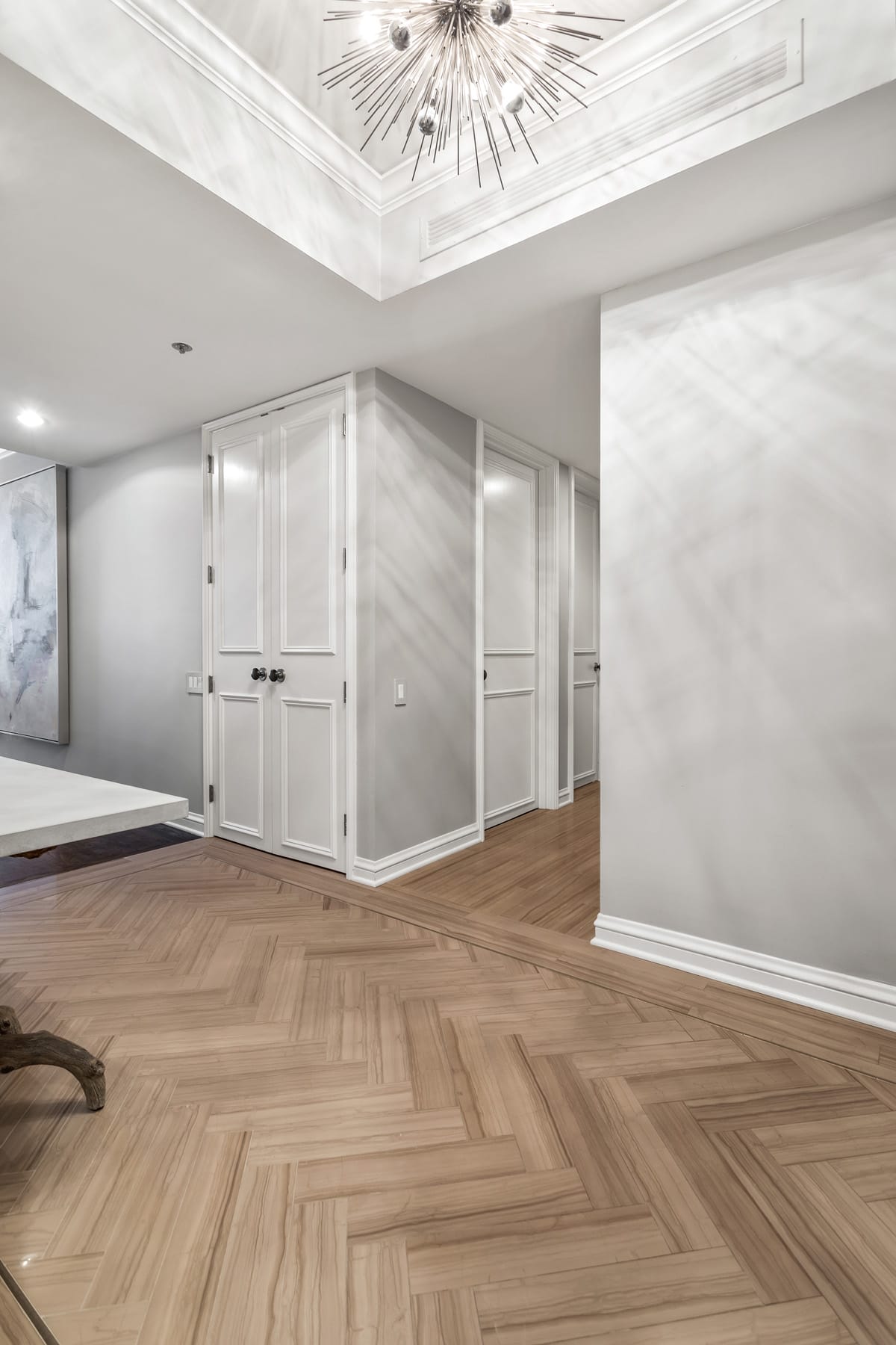 Our team set to work on a transformative redesign. The kitchen was reimagined with a transitional style, introducing a waterfall thickened mitered edge island that became a standout feature. An enlarged opening was crafted to connect the kitchen seamlessly with the dining room, enhancing the flow between spaces. French doors were added, offering the option to close off the kitchen when privacy was sought. Moreover, the master bathroom was given a contemporary overhaul, styled as a spa sanctuary with a steam shower and elegant marble wall cladding. The final result of this Chicago condo remodel embodies the essence of sophisticated city living, combining functionality with chic design elements.