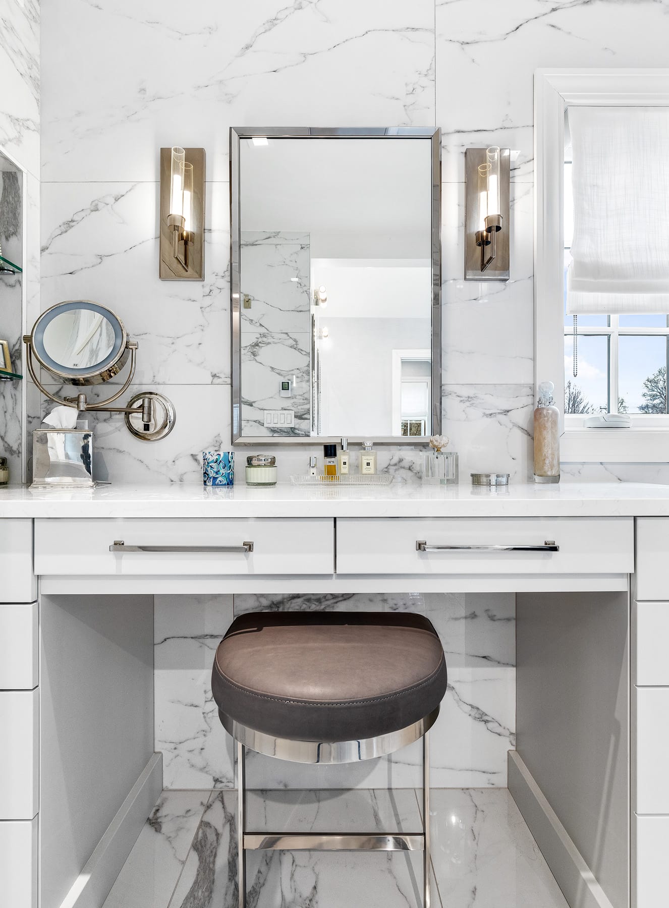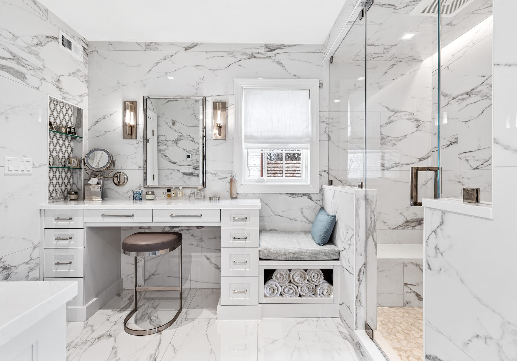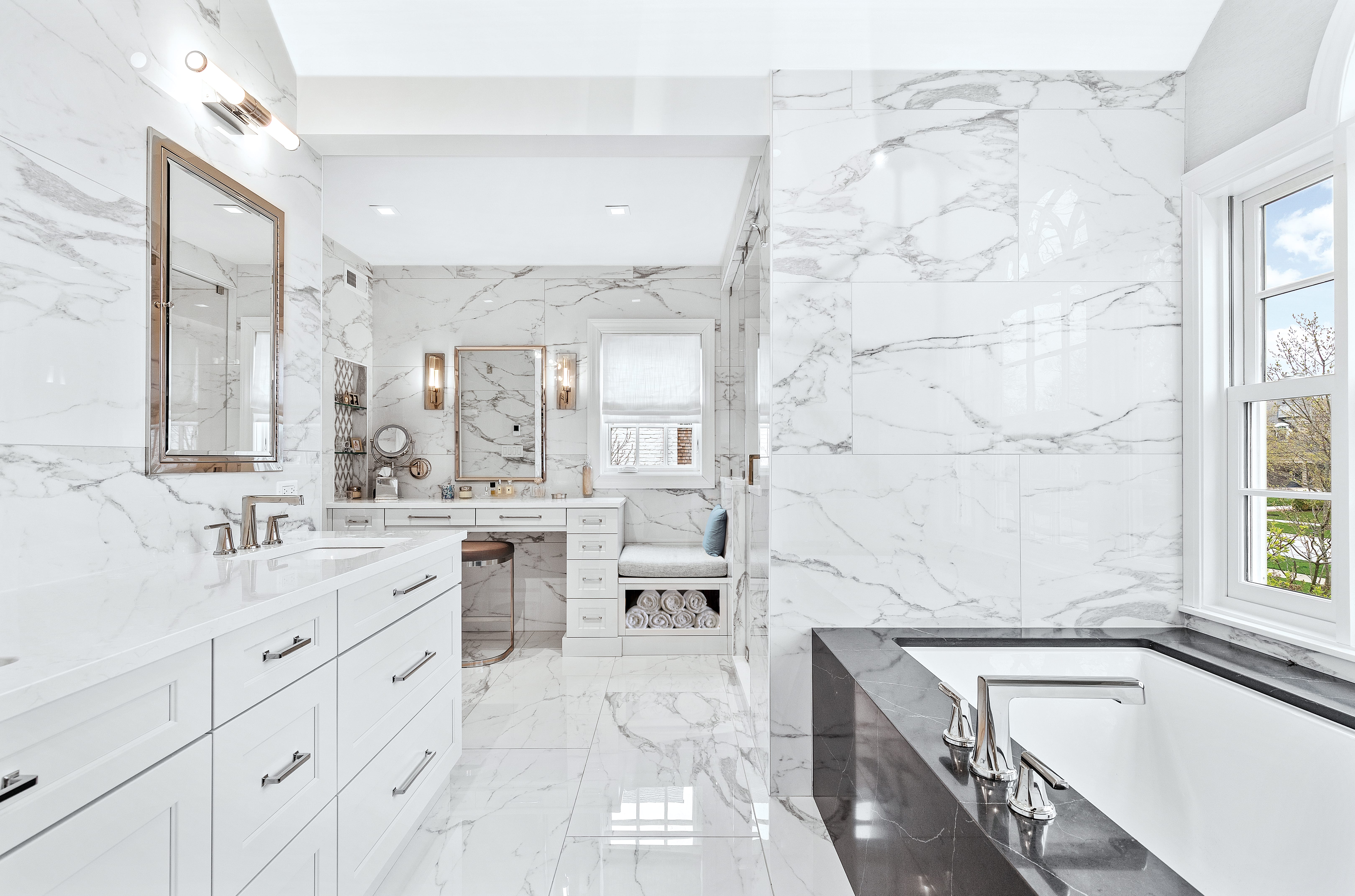 The objective of the Winnetka Master Bathroom, Garage, and Sunroom Remodel was to create a harmonious fusion of indoor and outdoor living spaces. The clients sought to go beyond the traditional bathroom and garage spaces, aiming to seamlessly blend nature with luxury while incorporating an old-world design charm.