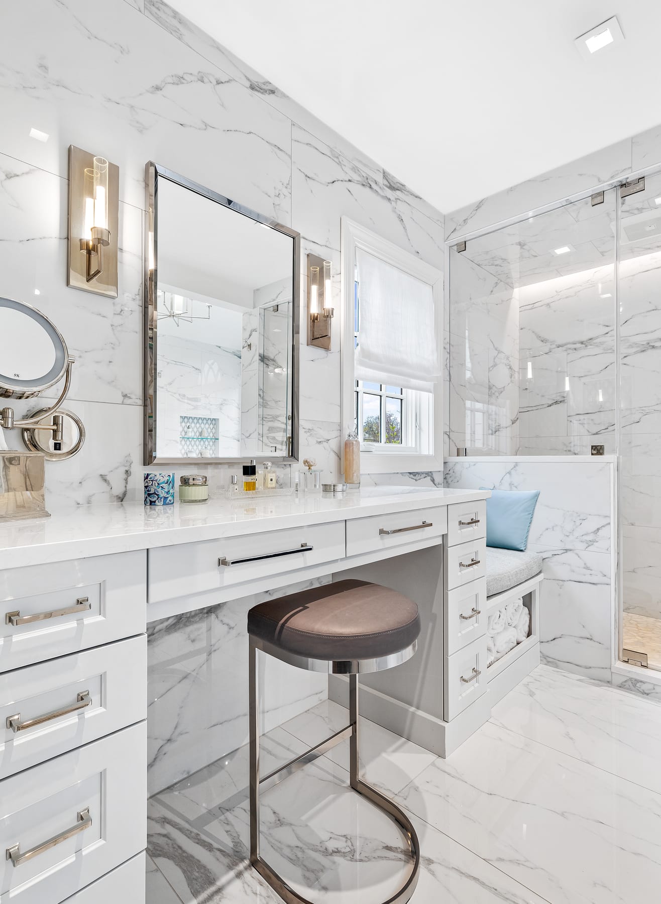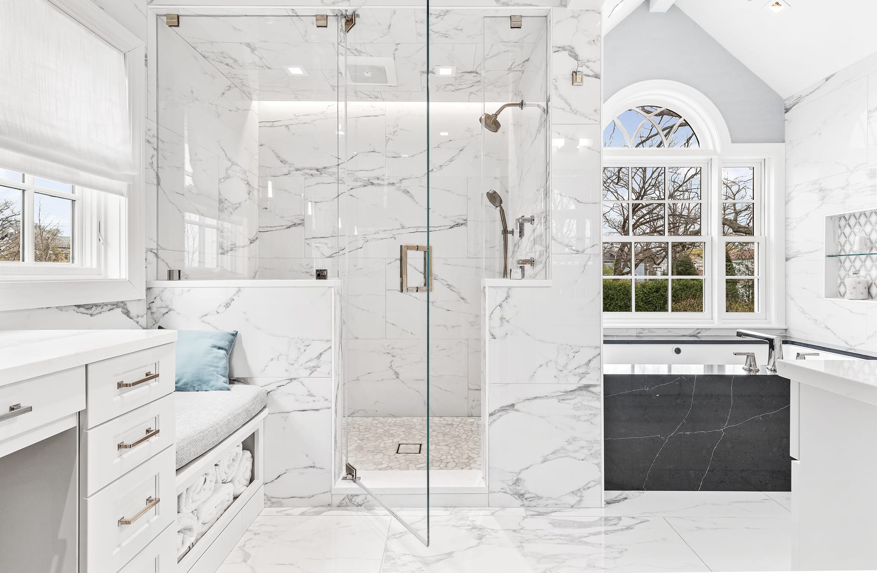 The objective of the Winnetka Master Bathroom, Garage, and Sunroom Remodel was to create a harmonious fusion of indoor and outdoor living spaces. The clients sought to go beyond the traditional bathroom and garage spaces, aiming to seamlessly blend nature with luxury while incorporating an old-world design charm.