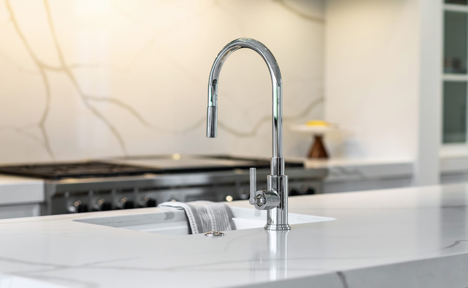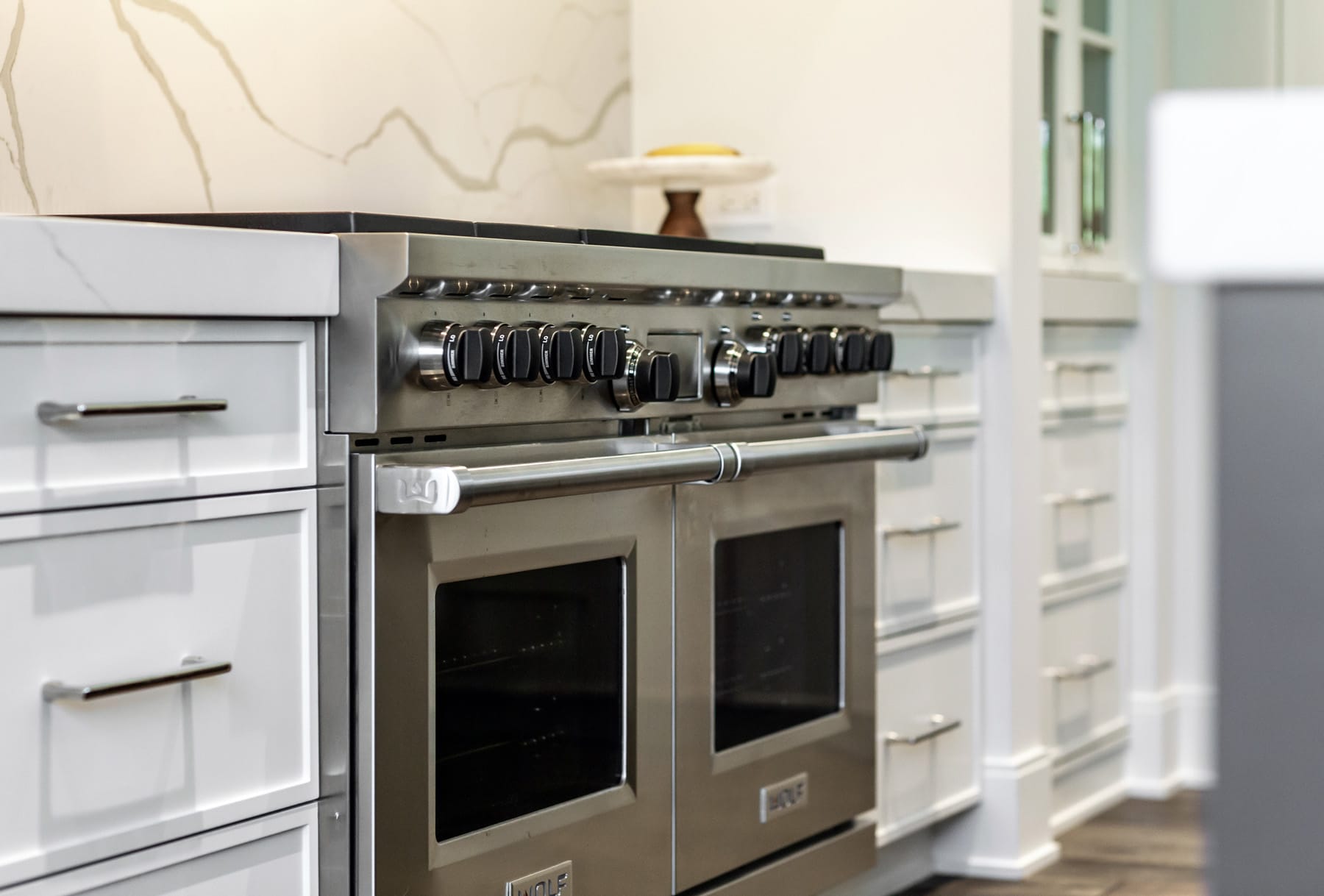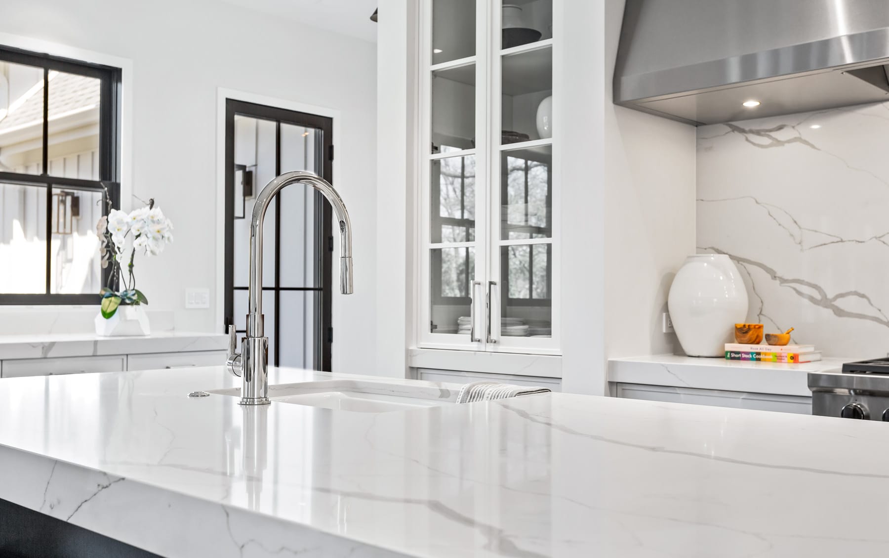 Contemporary kitchen with glass-front island