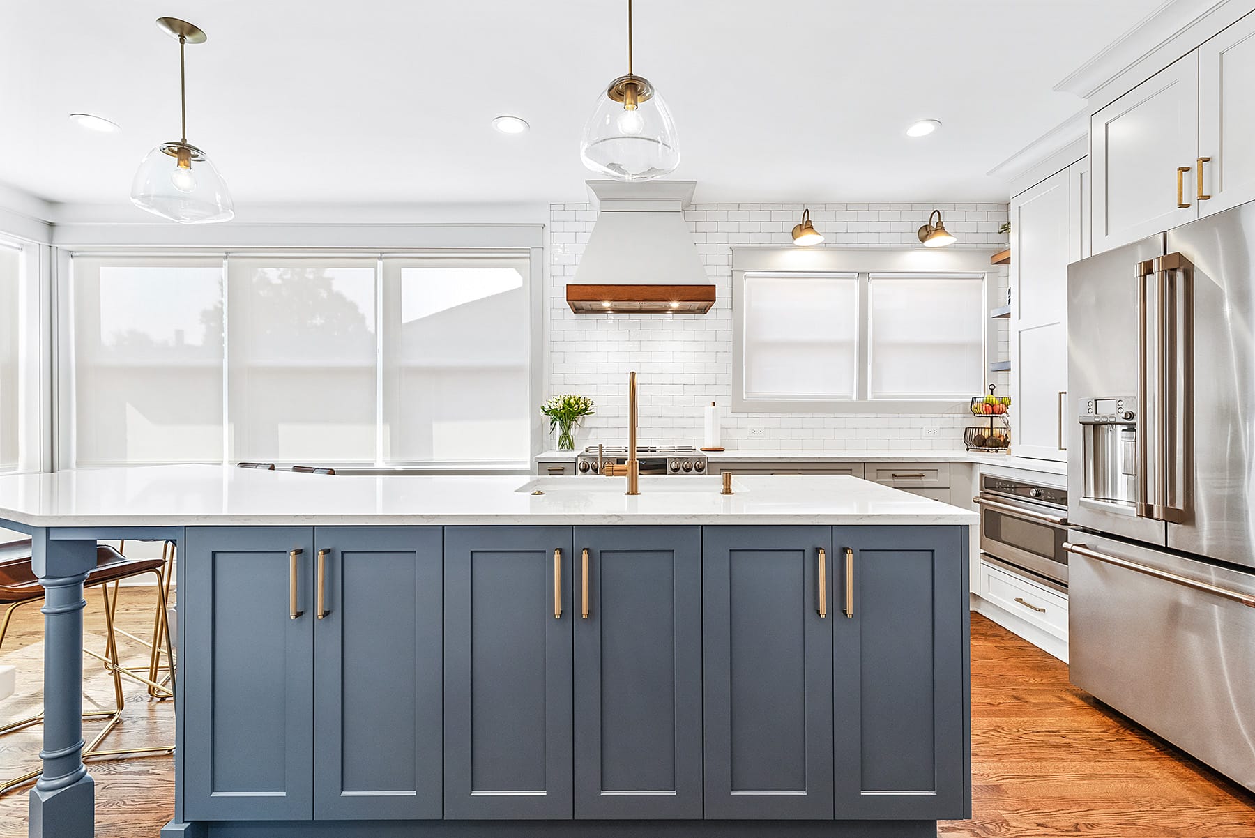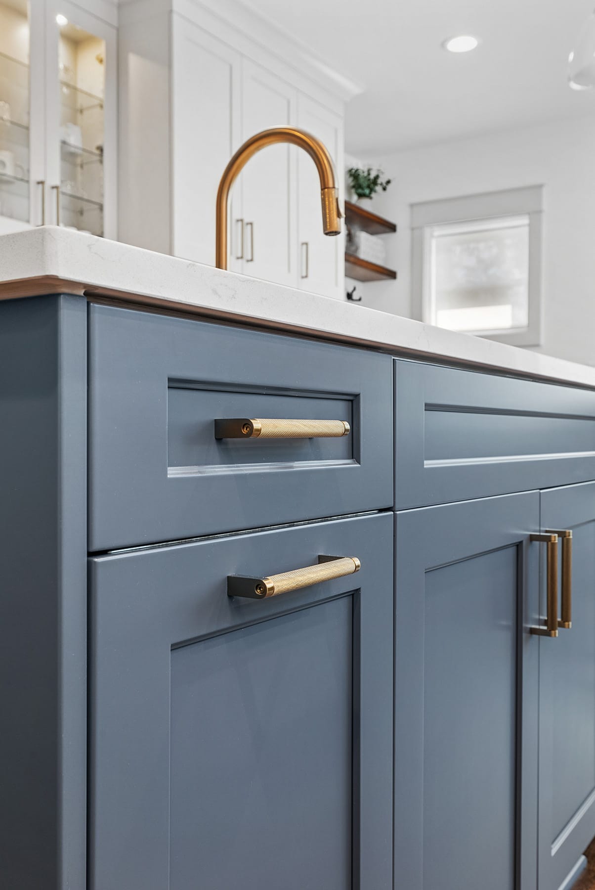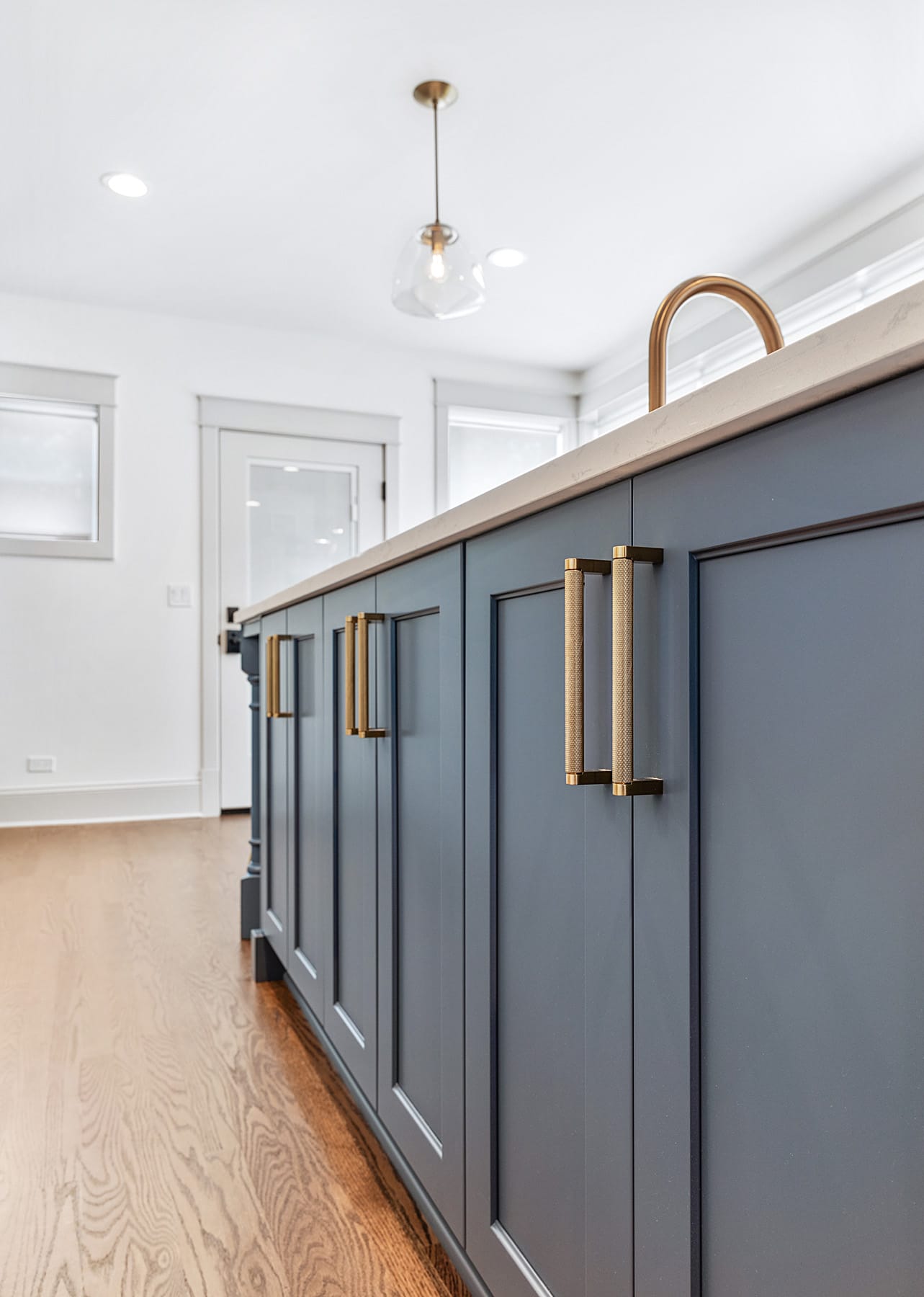 Contemporary kitchen with glass-front island