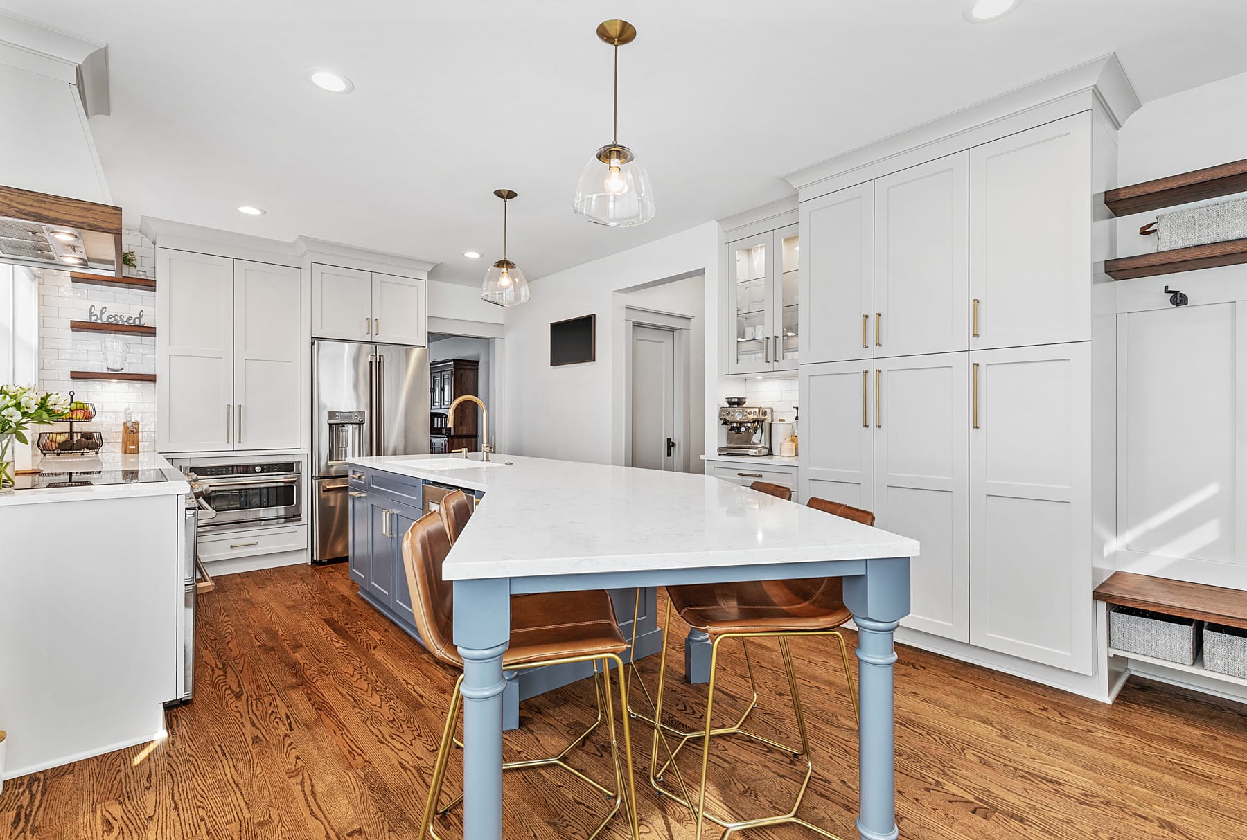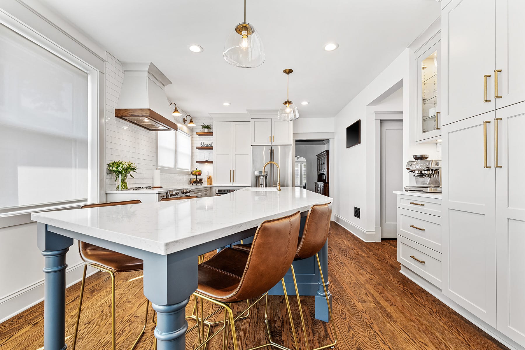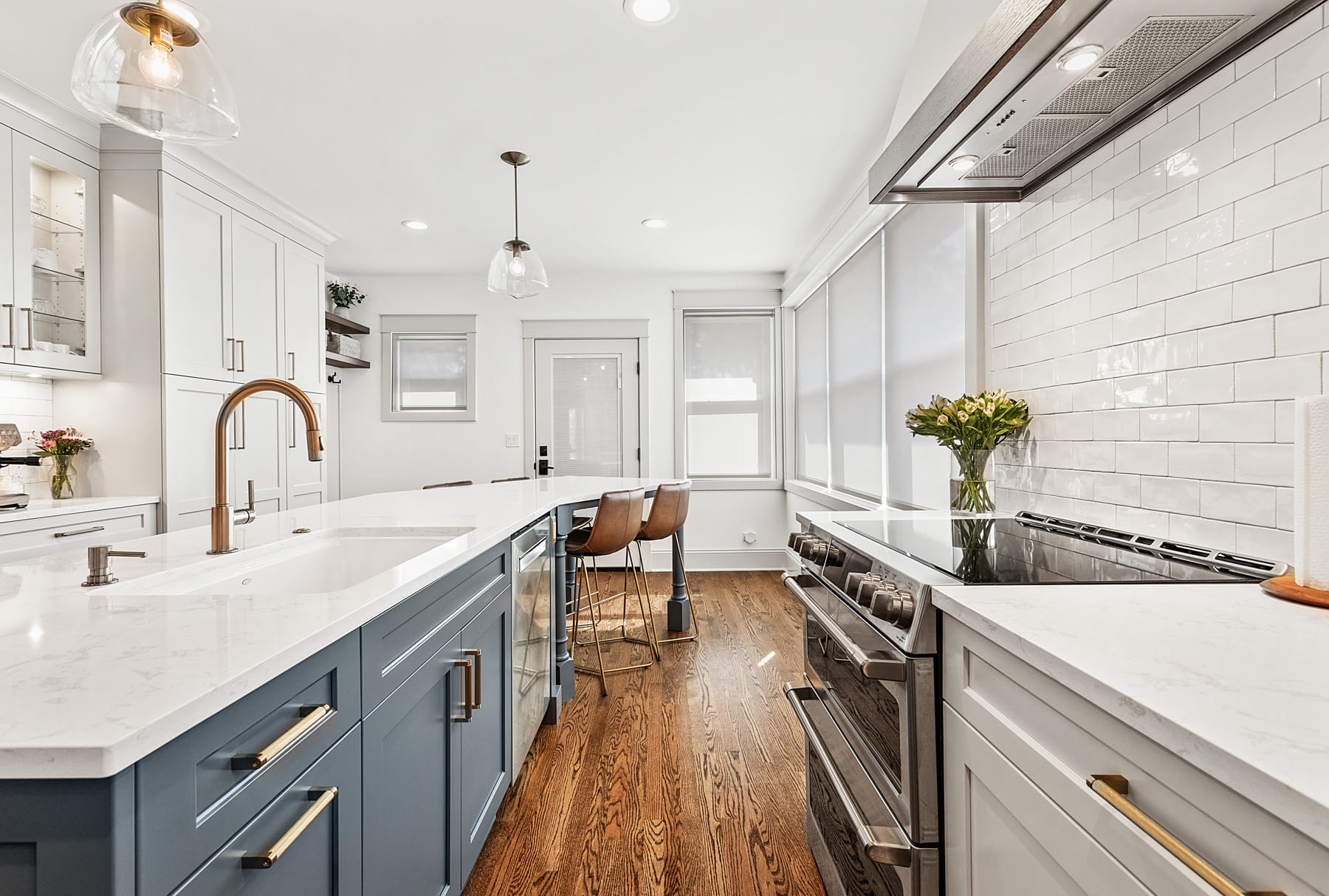Contemporary kitchen with glass-front island