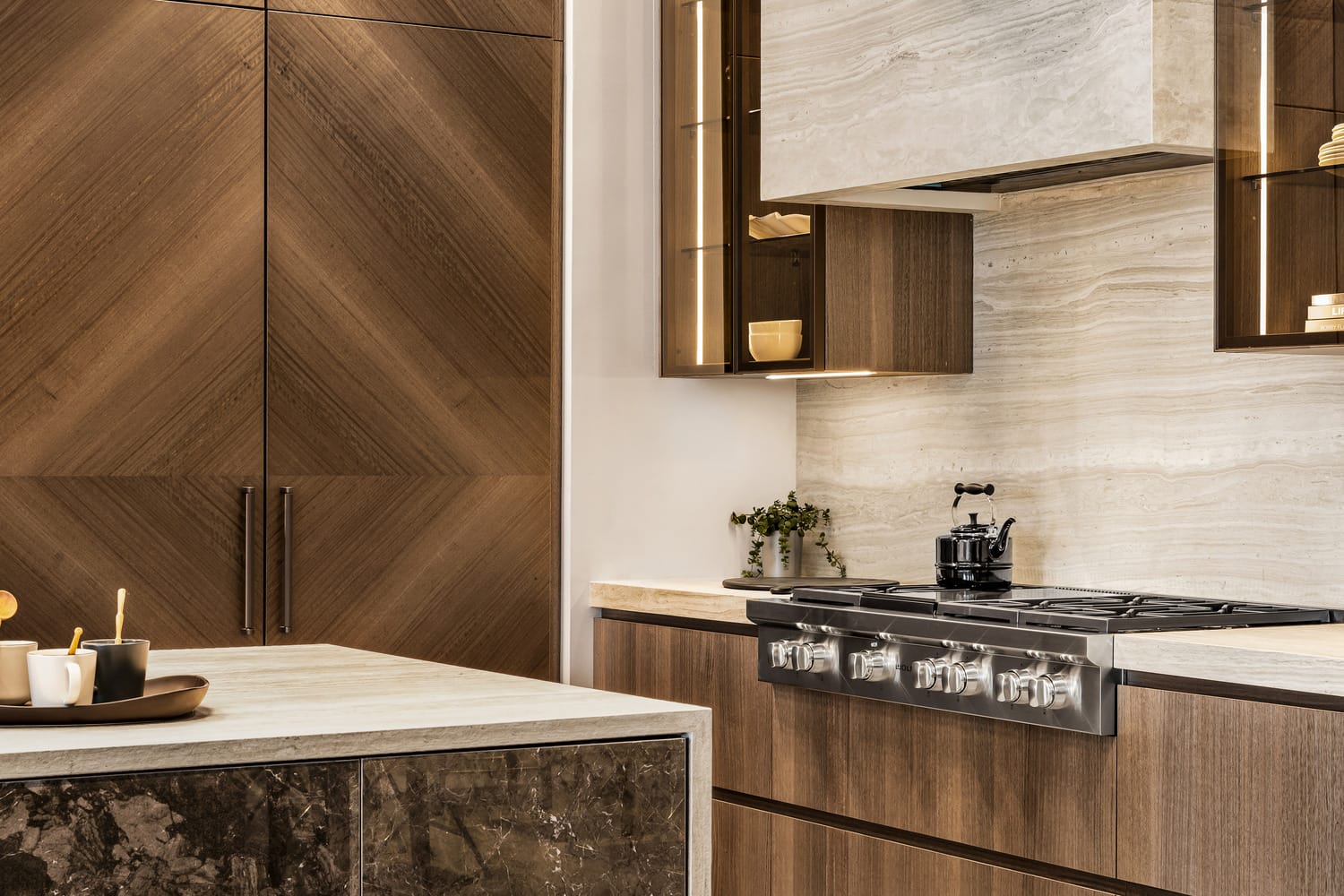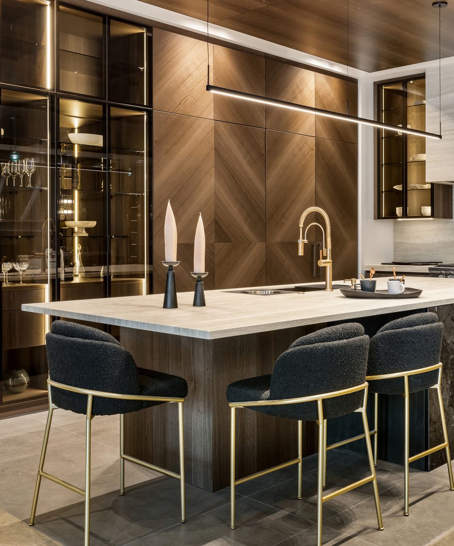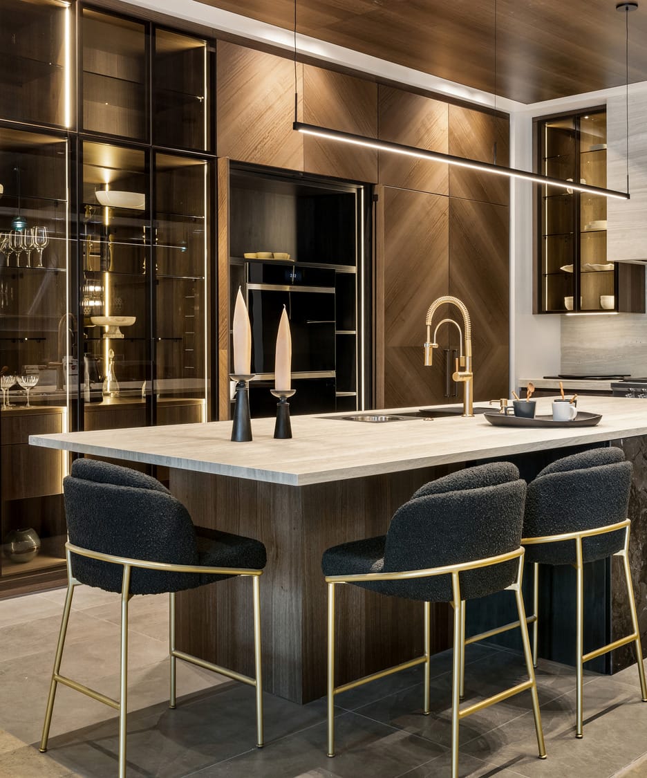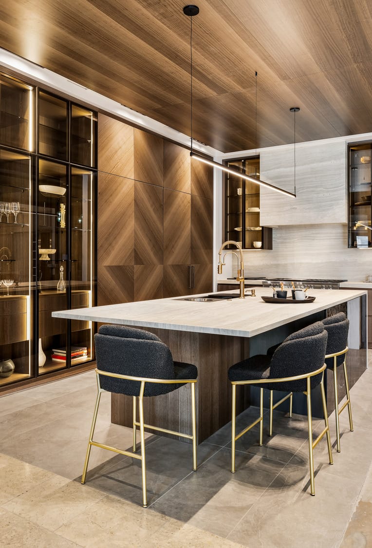 Contemporary kitchen with glass-front island