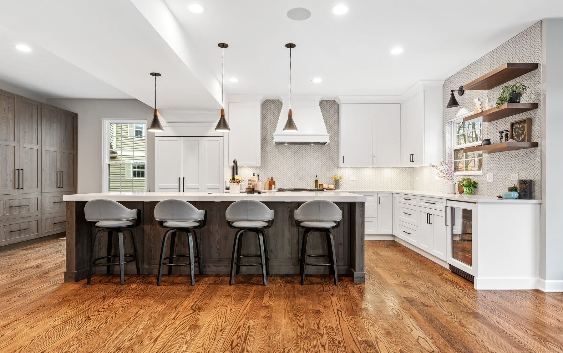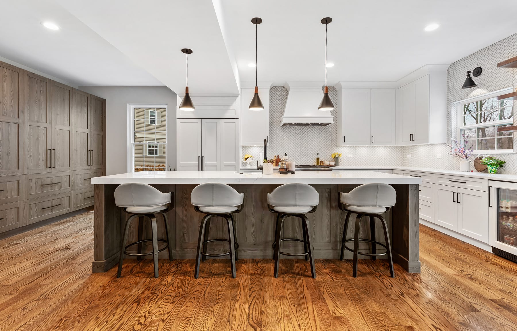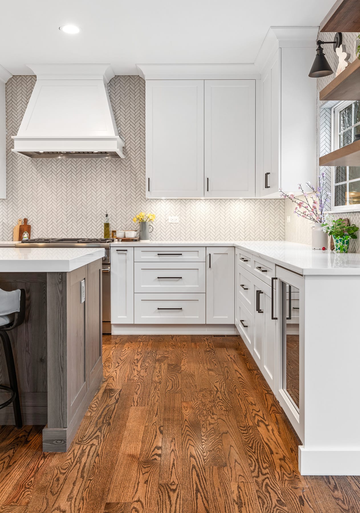Contemporary kitchen with glass-front island