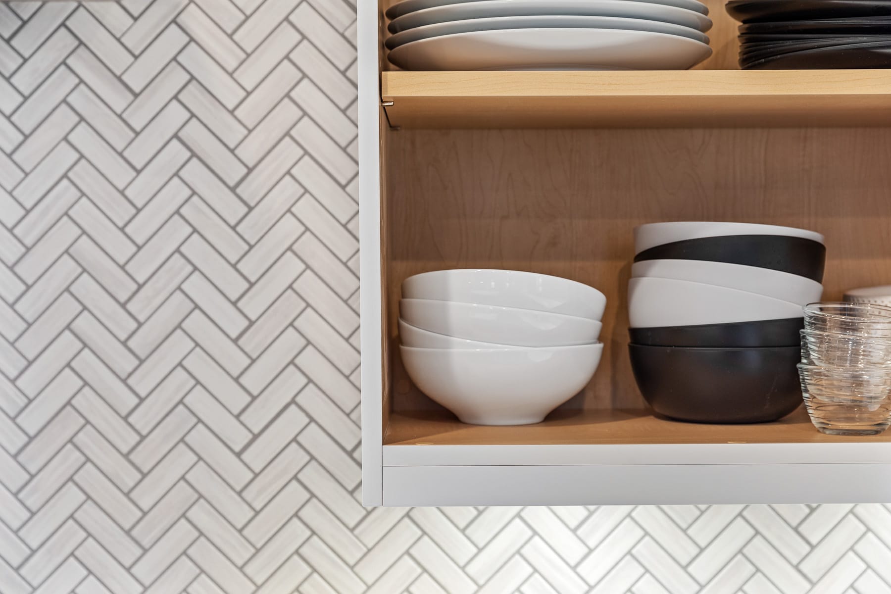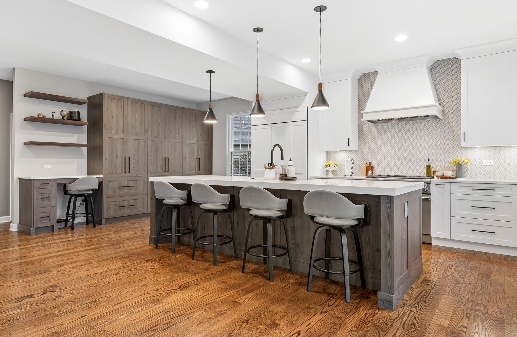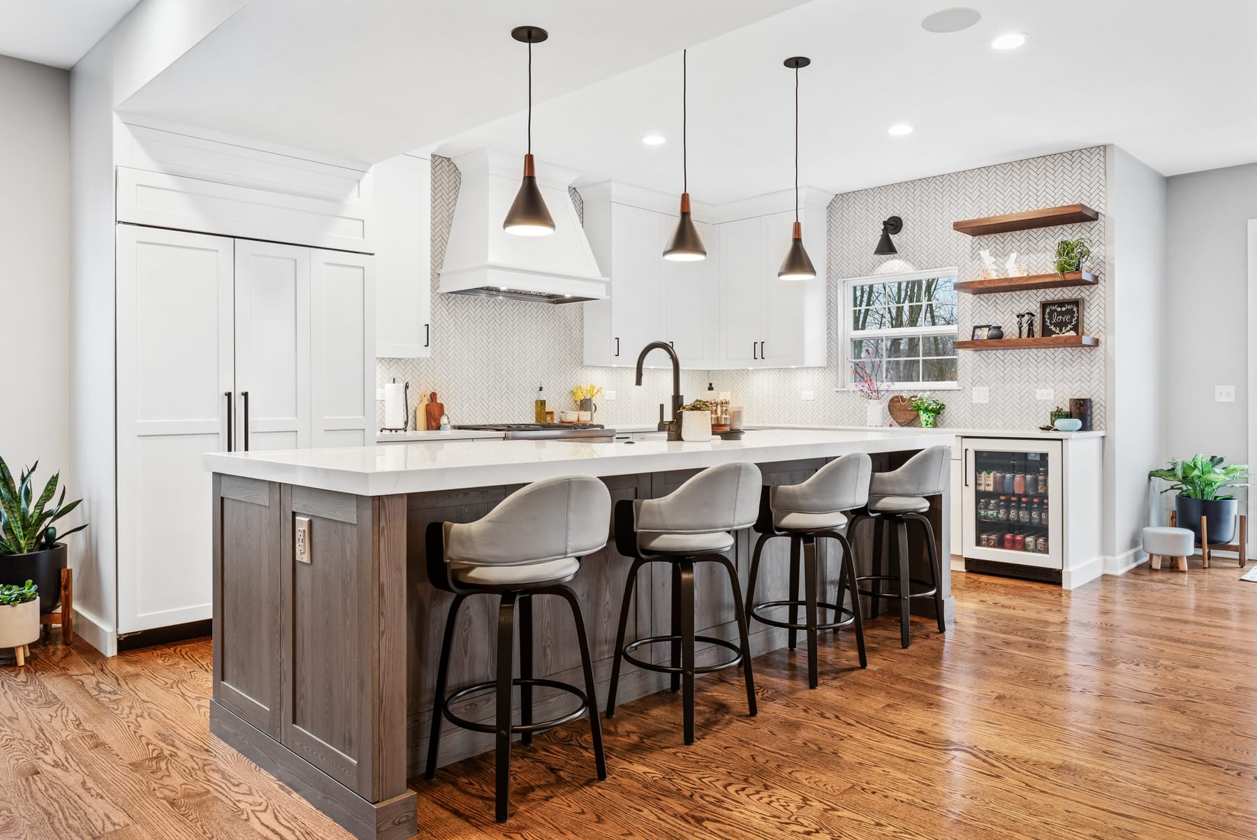 Contemporary kitchen with glass-front island
