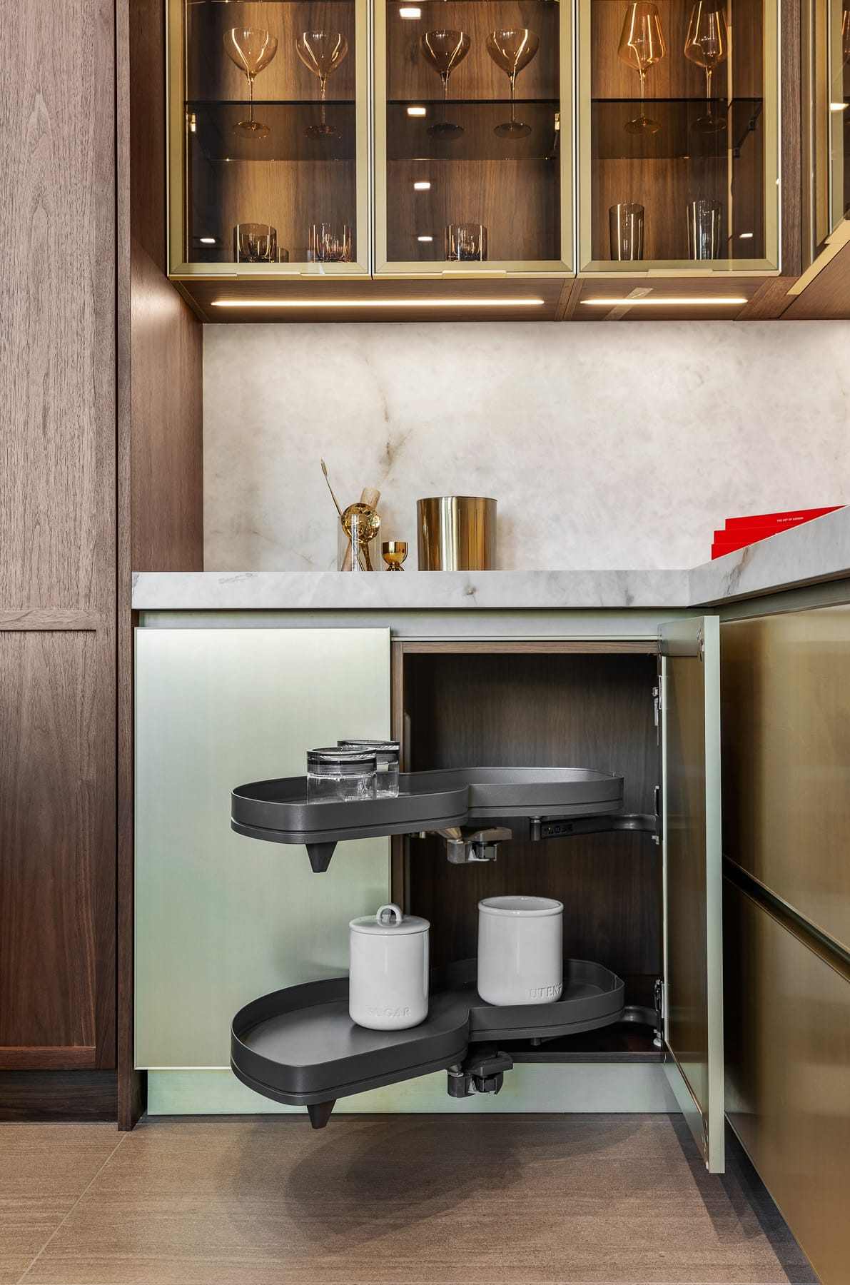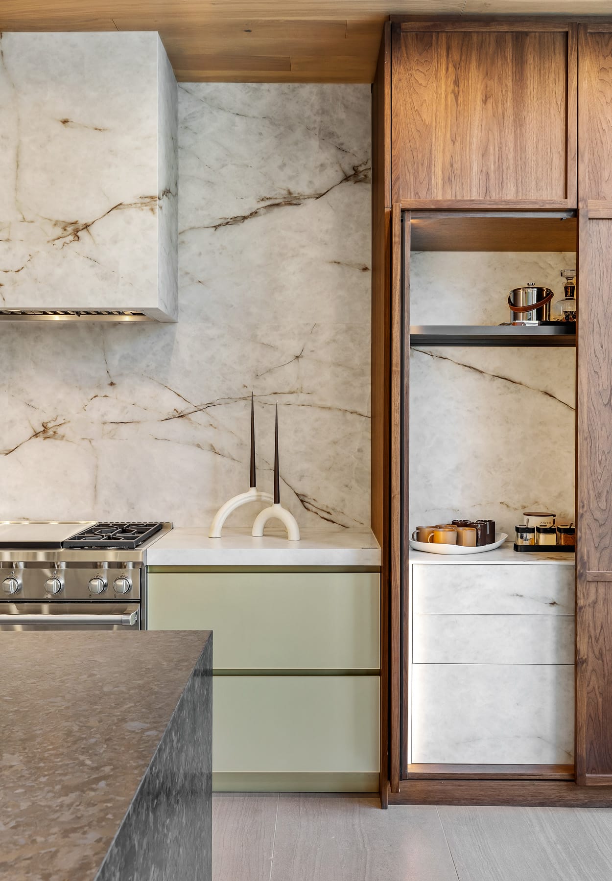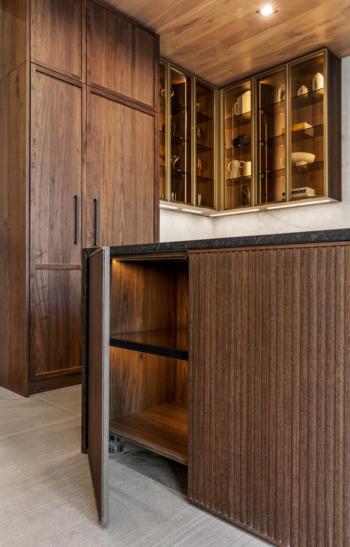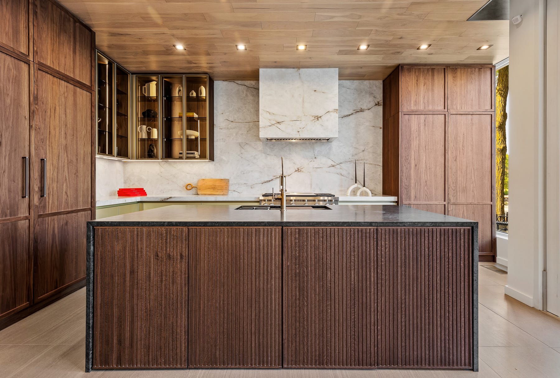 Contemporary kitchen with glass-front island