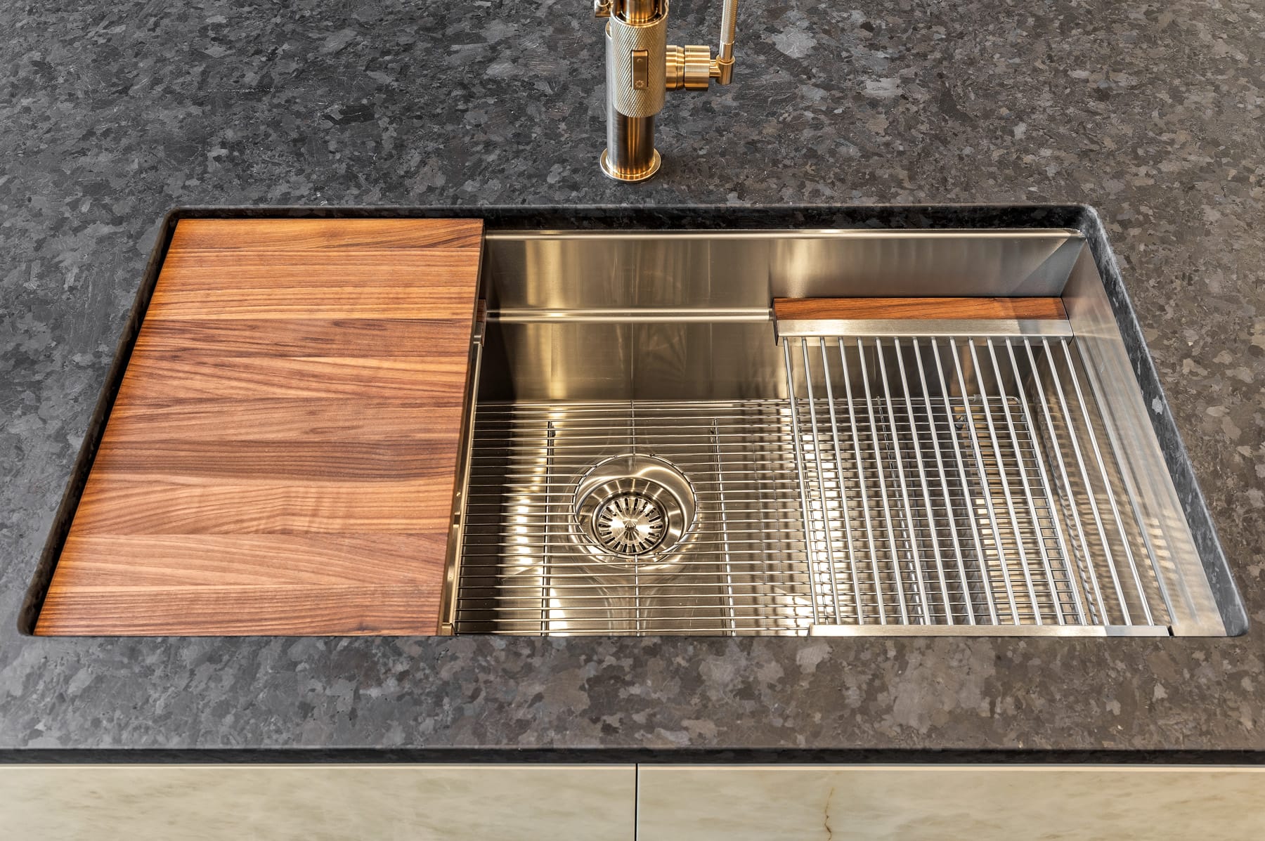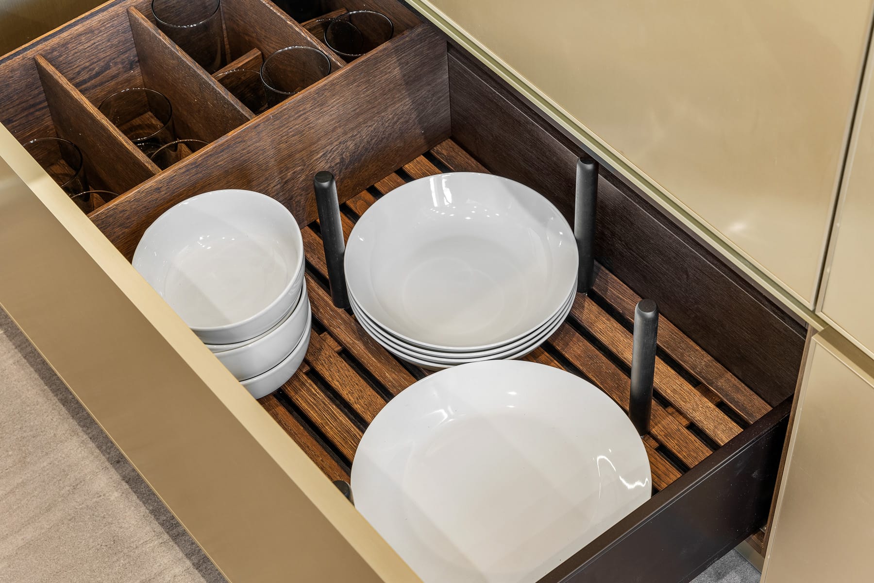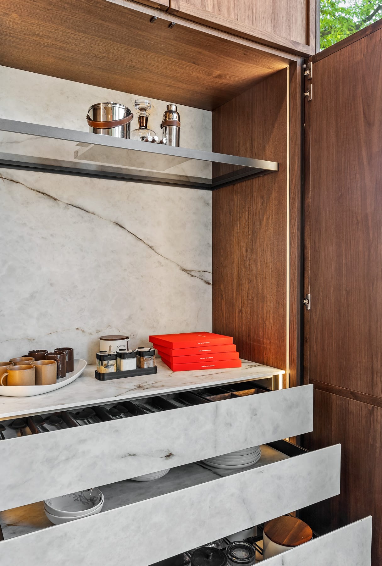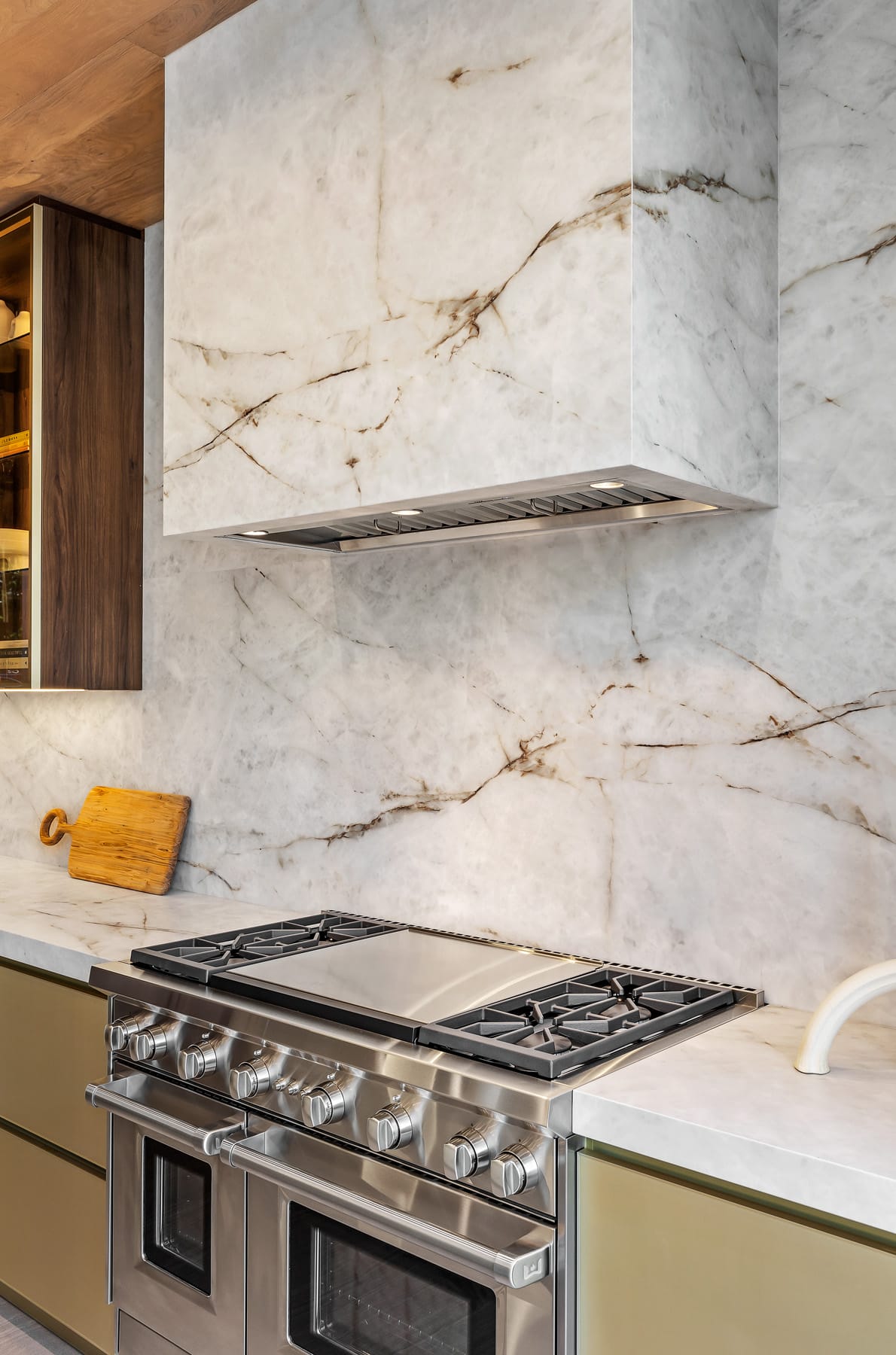 Contemporary kitchen with glass-front island