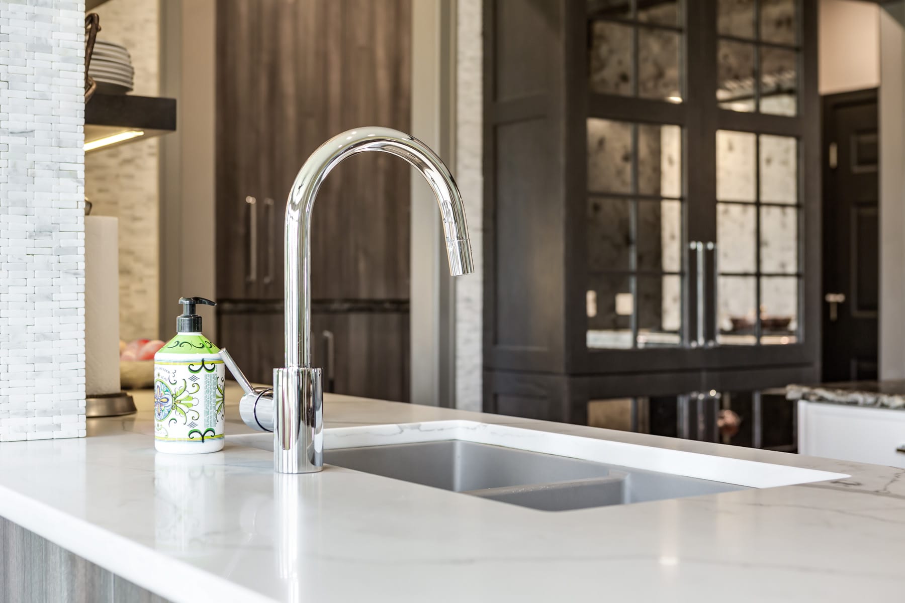 Contemporary kitchen with glass-front island
