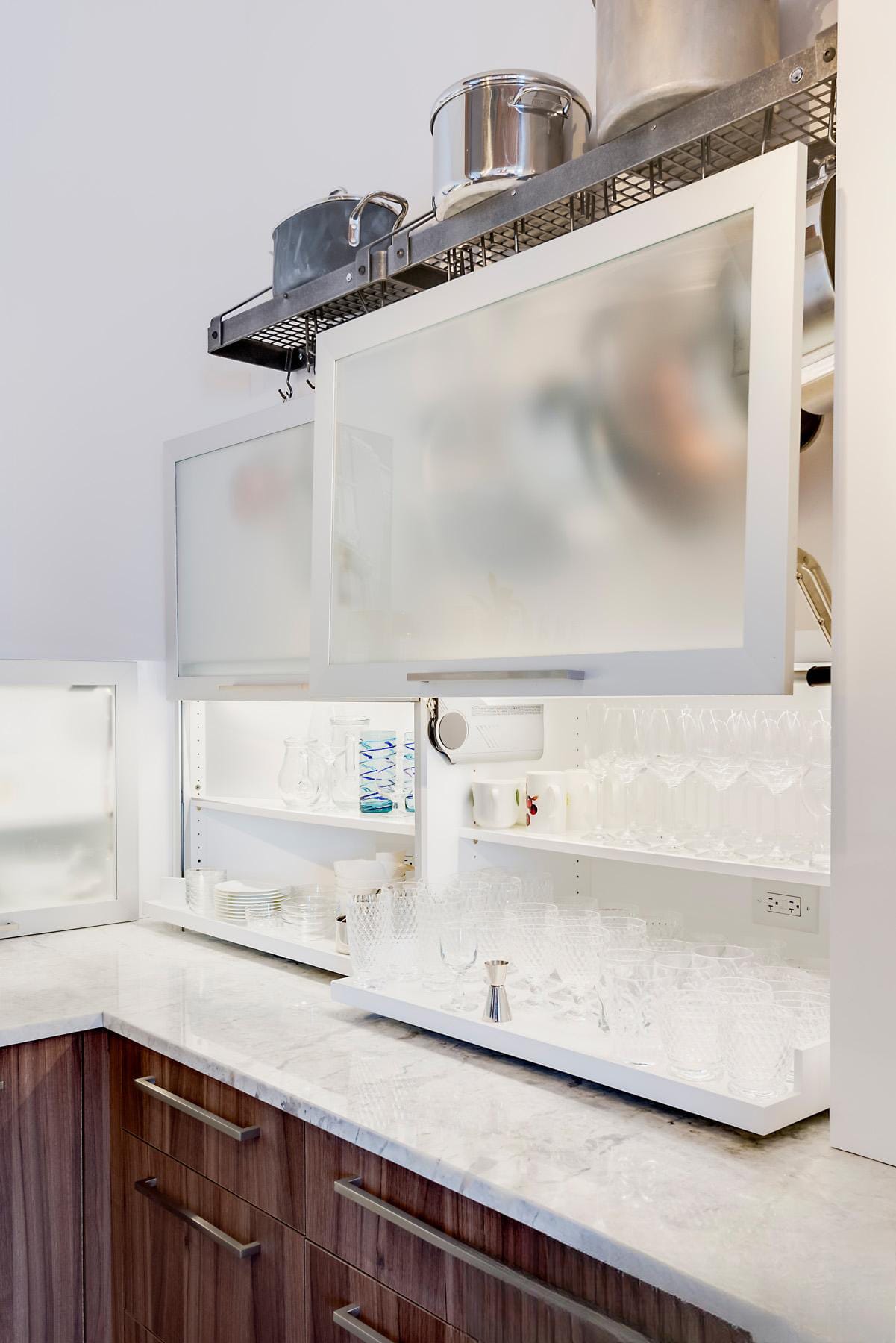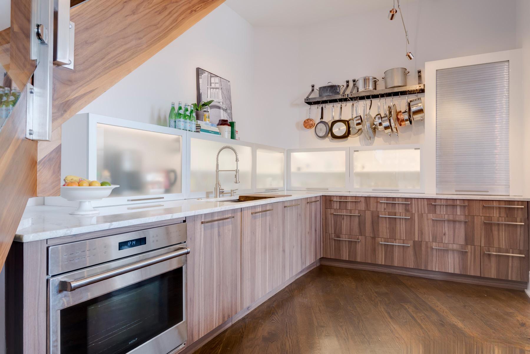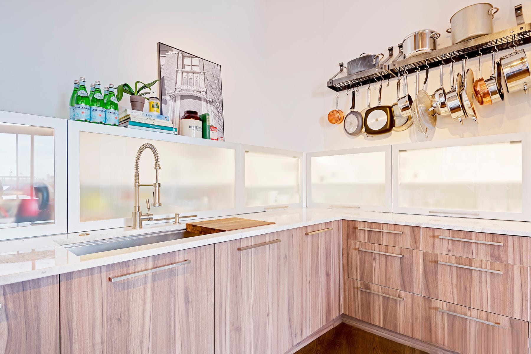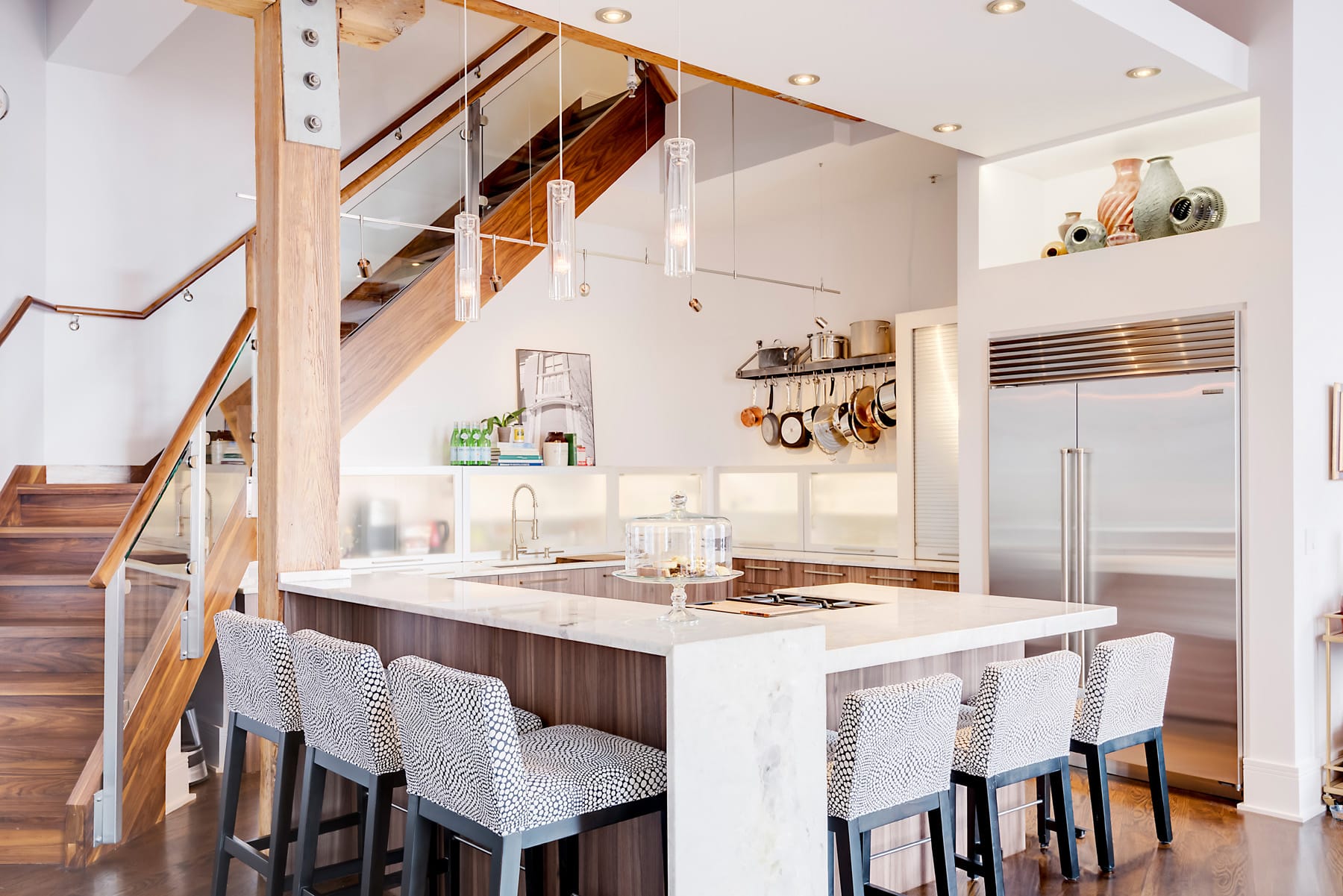 Contemporary kitchen with glass-front island