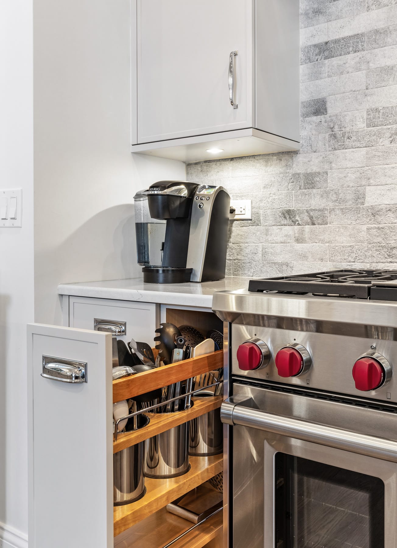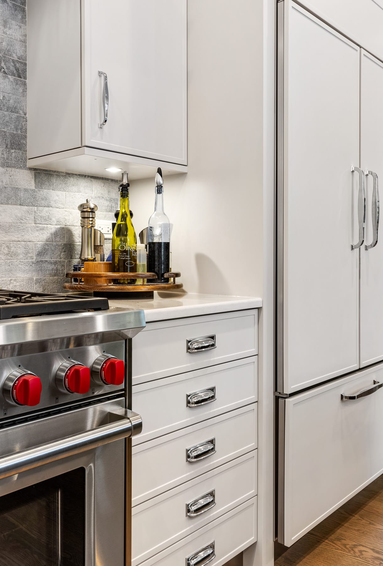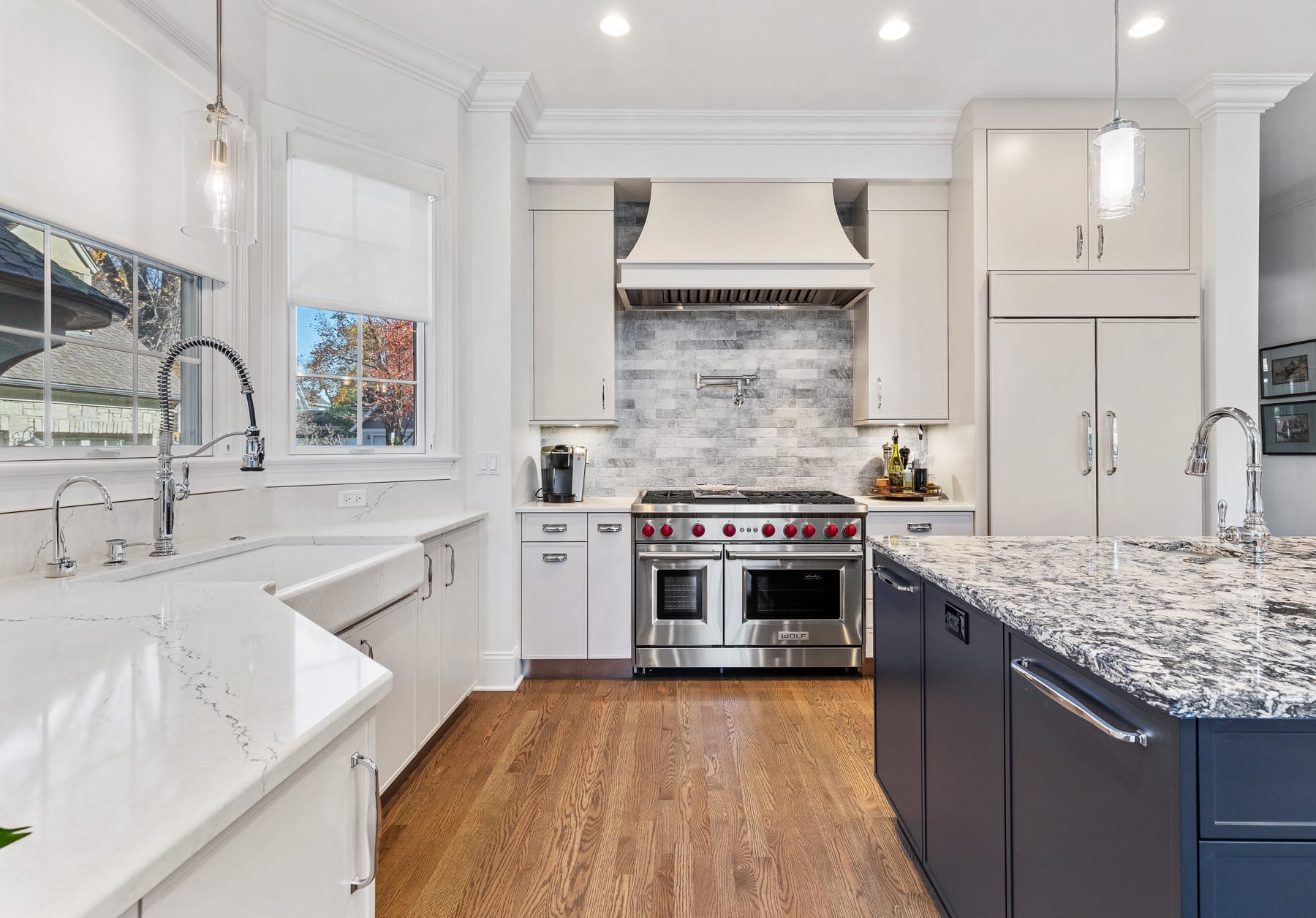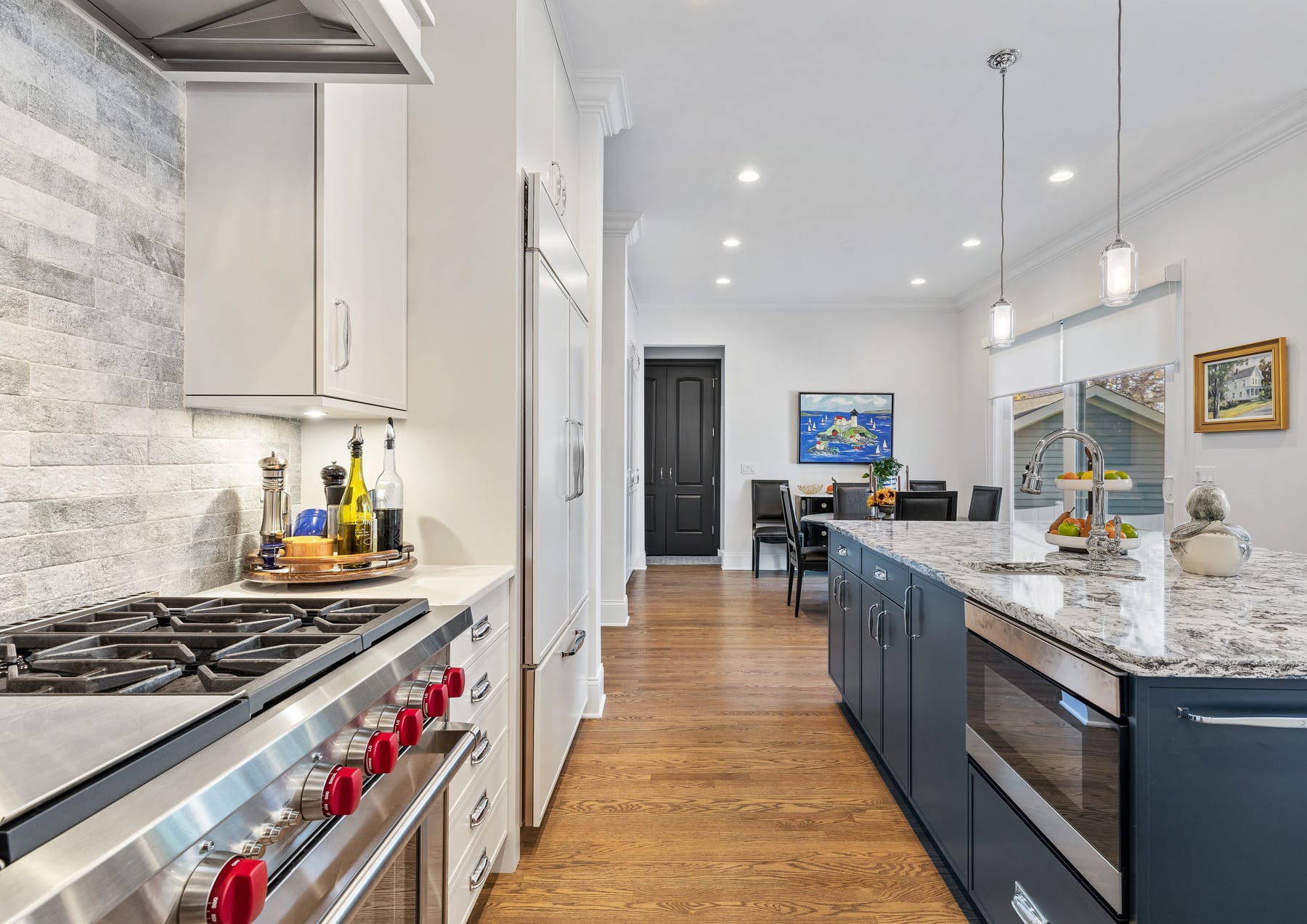 Enhance this Hinsdale home’s spaces to match the homeowners’ culinary aspirations as professional chefs. The aim was to enlarge the kitchen with a functional cook’s range area and island and recreate a less crowded kitchen dining area with more natural light and views to the rear yard. Lastly, we wanted more pantry space and a coffee center for more barista style brewing and preparation area.