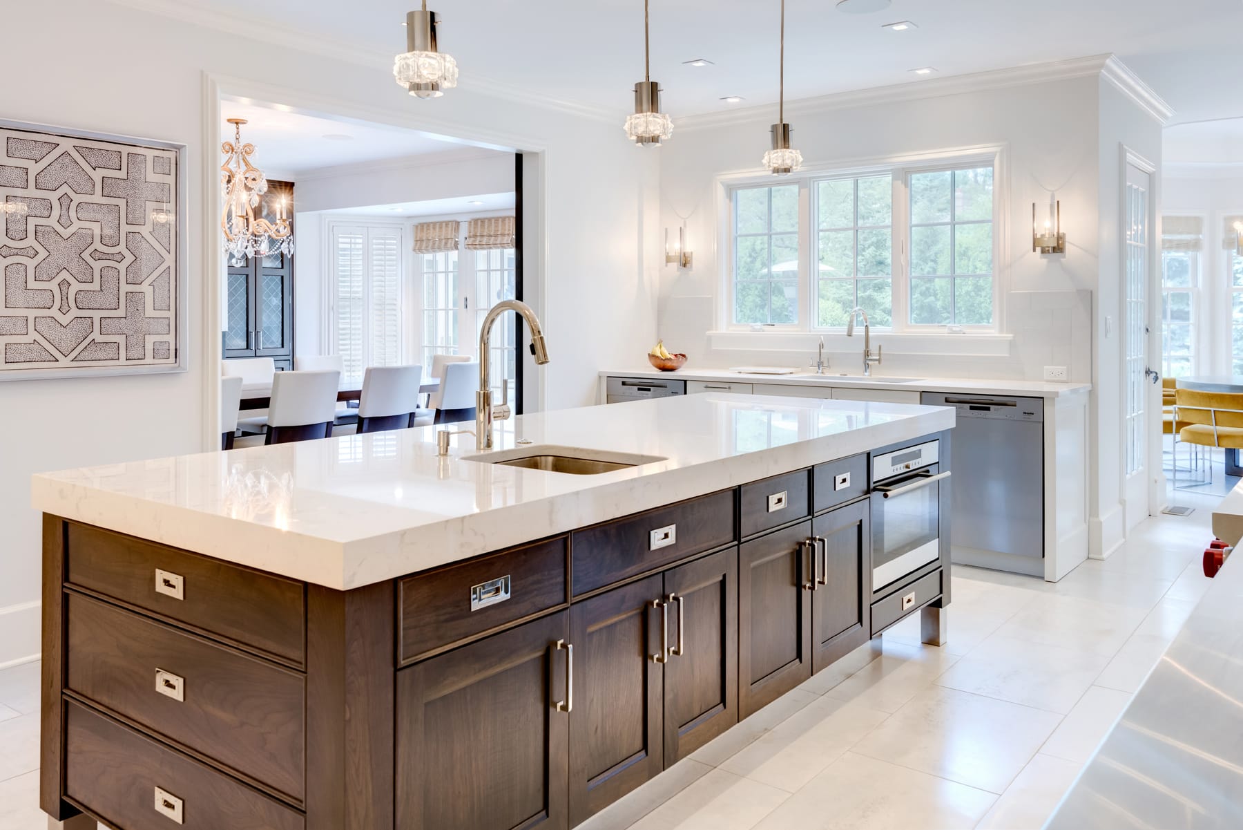 The result is a journey through interiors that resonate with harmonious elegance. The kitchen, mudroom, pantry, dining area, foyer, and staircase form a tapestry of design that seamlessly blends bespoke craftsmanship and functionality. The furniture-style island stands as a centerpiece, not only for its visual appeal but also for its utility.