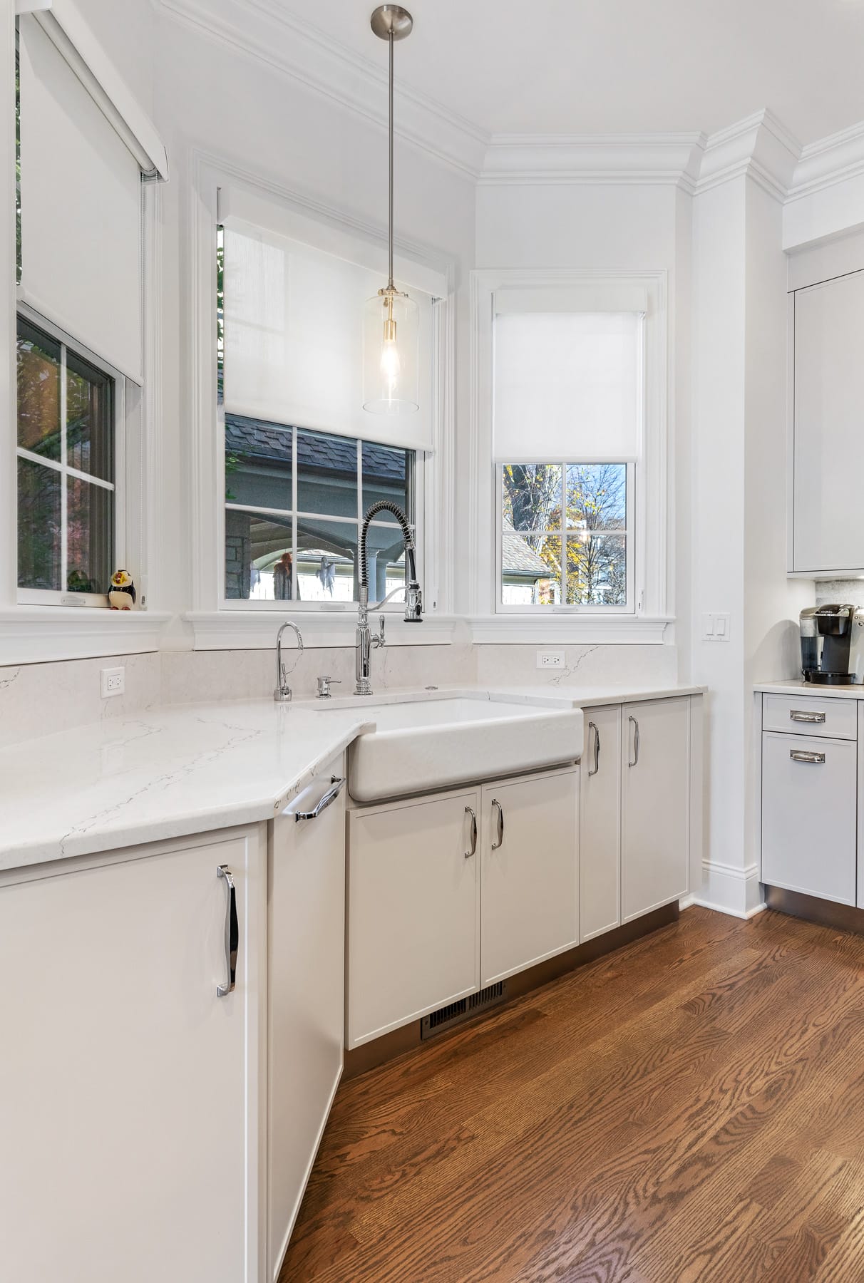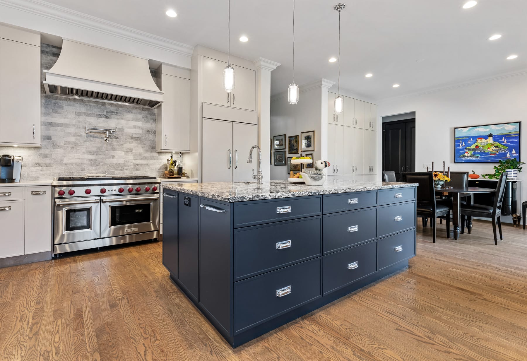 Enhance this Hinsdale home’s spaces to match the homeowners’ culinary aspirations as professional chefs. The aim was to enlarge the kitchen with a functional cook’s range area and island and recreate a less crowded kitchen dining area with more natural light and views to the rear yard. Lastly, we wanted more pantry space and a coffee center for more barista style brewing and preparation area.