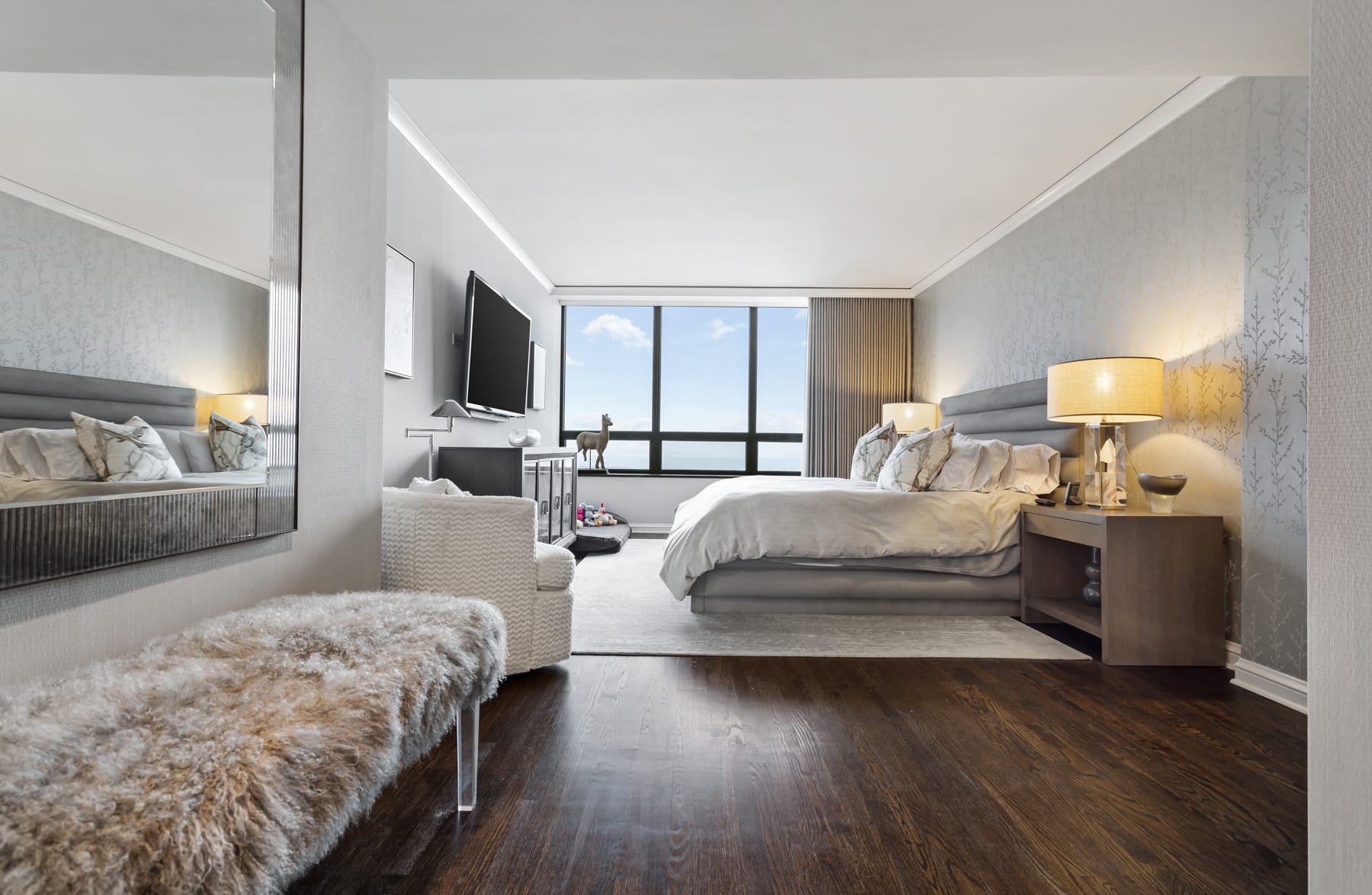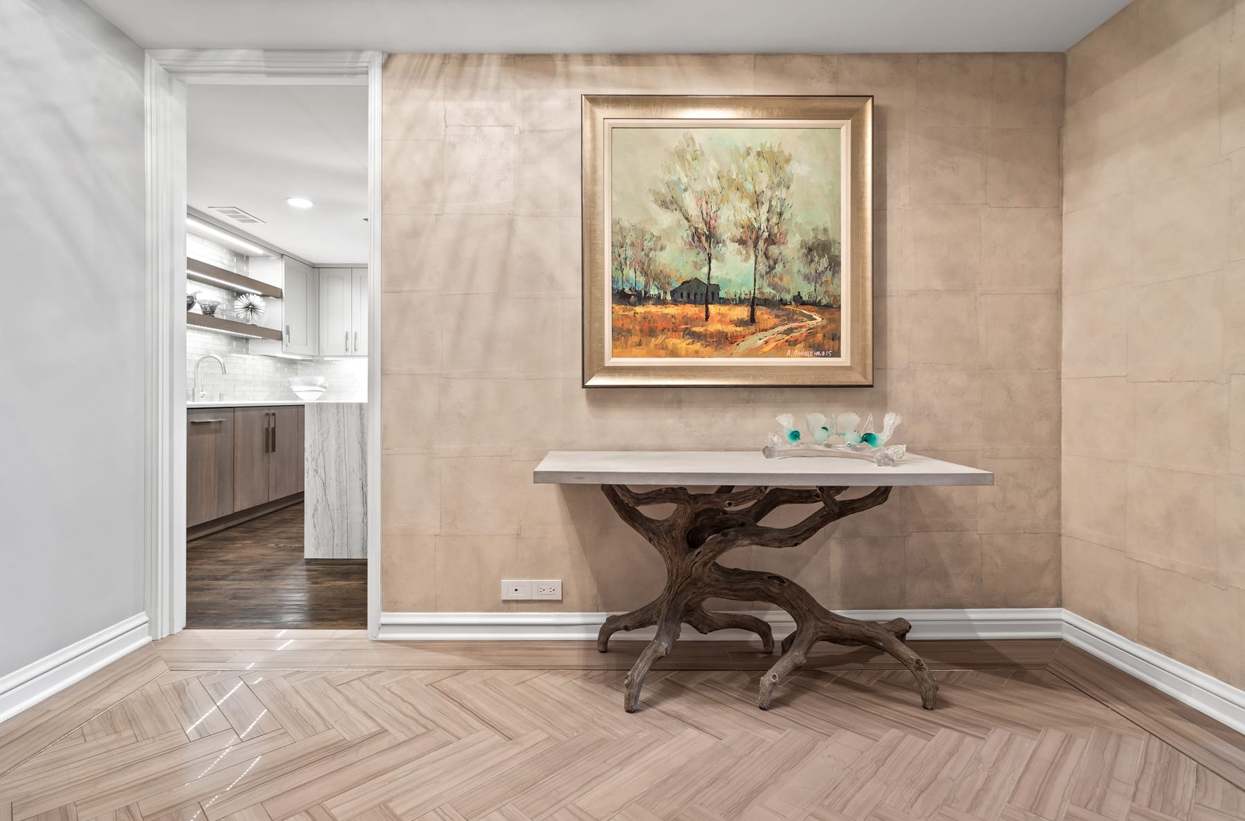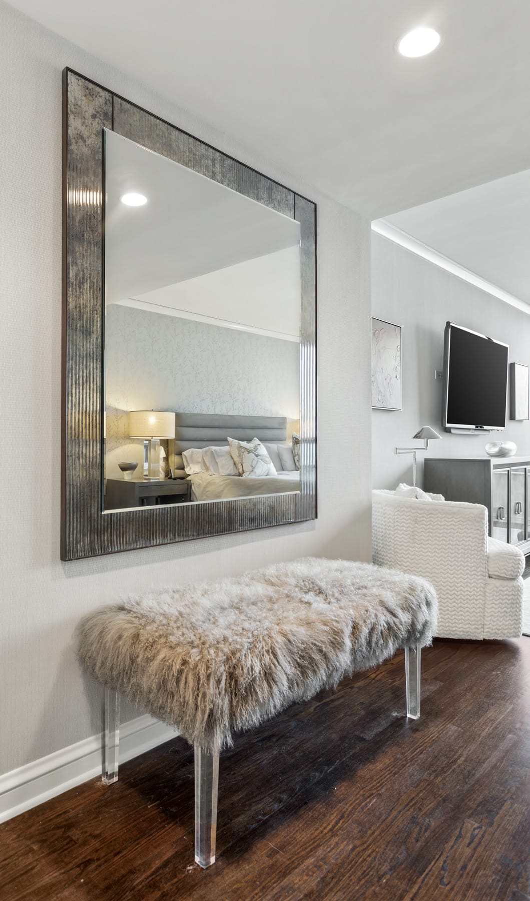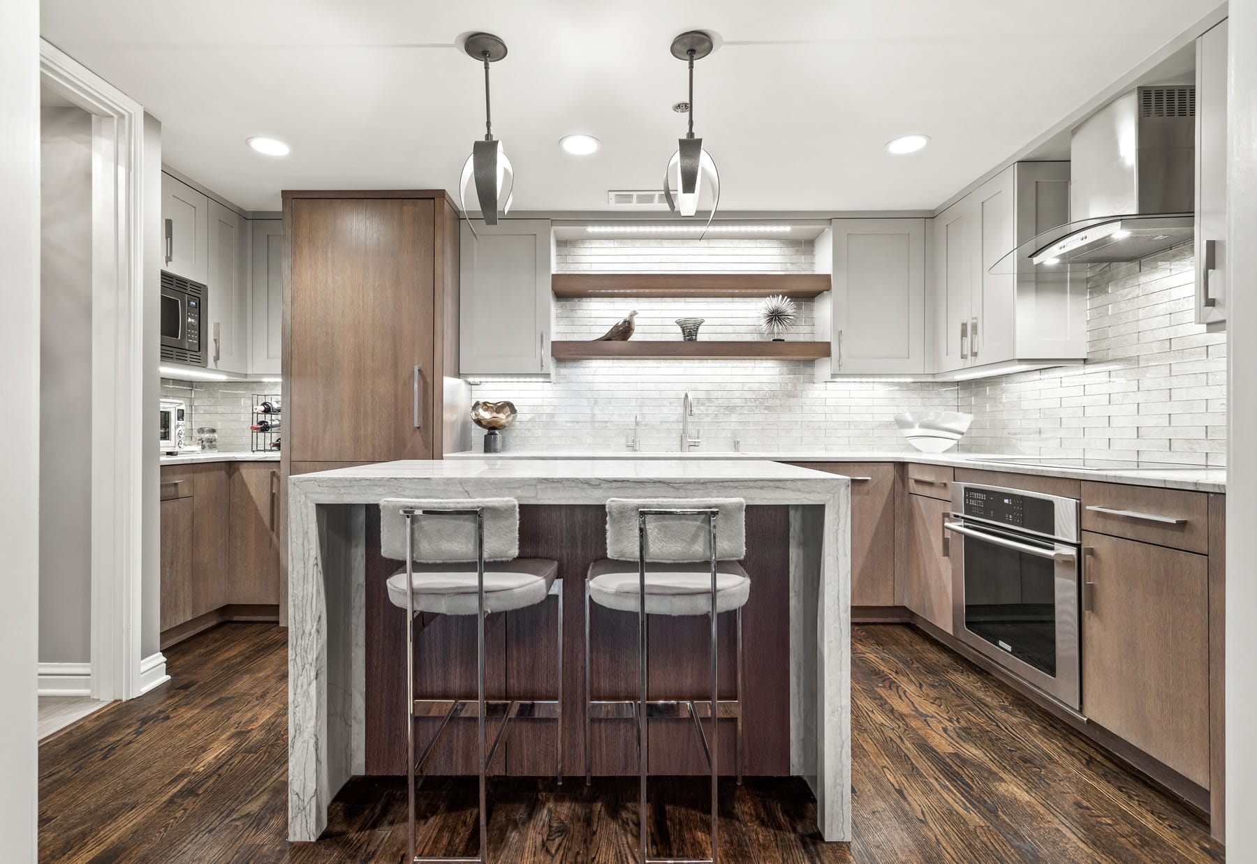 Our team set to work on a transformative redesign. The kitchen was reimagined with a transitional style, introducing a waterfall thickened mitered edge island that became a standout feature. An enlarged opening was crafted to connect the kitchen seamlessly with the dining room, enhancing the flow between spaces. French doors were added, offering the option to close off the kitchen when privacy was sought. Moreover, the master bathroom was given a contemporary overhaul, styled as a spa sanctuary with a steam shower and elegant marble wall cladding. The final result of this Chicago condo remodel embodies the essence of sophisticated city living, combining functionality with chic design elements.