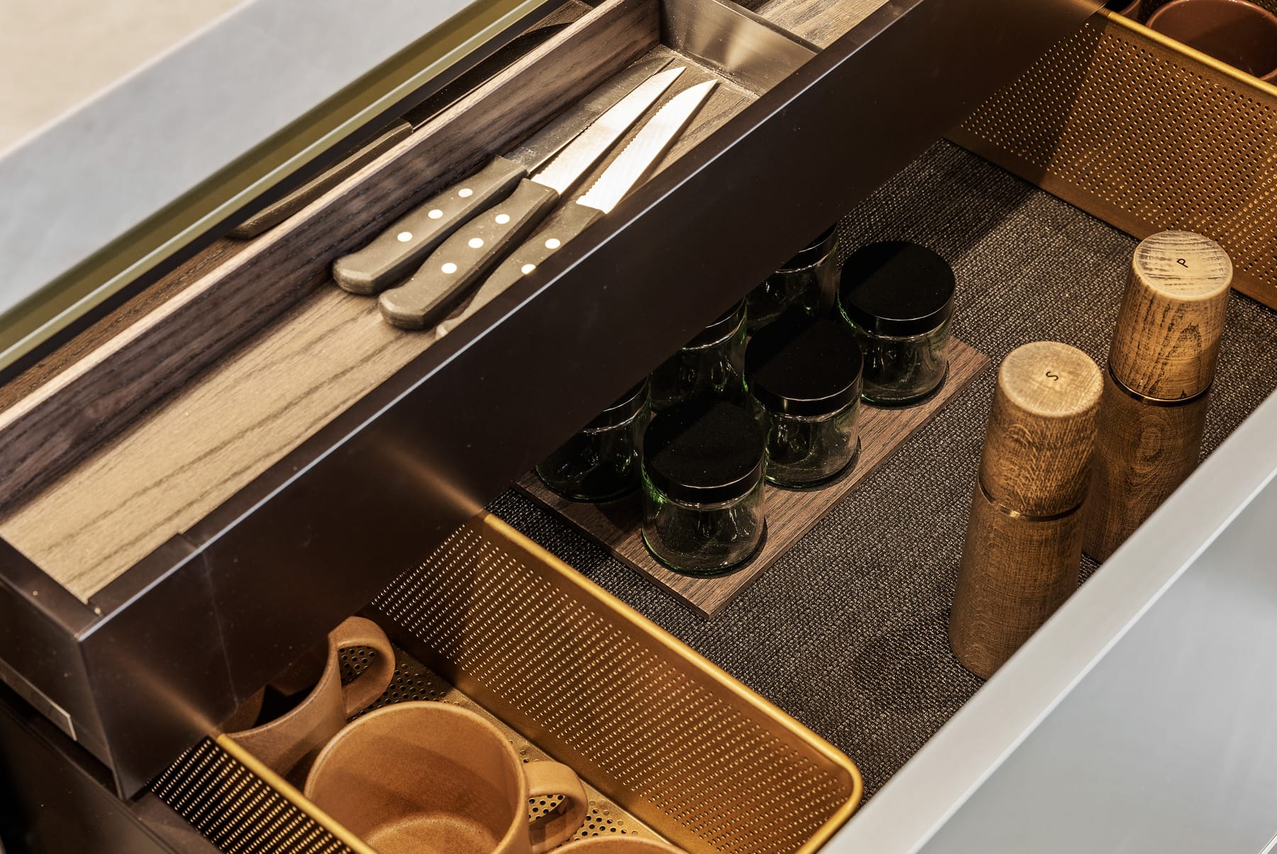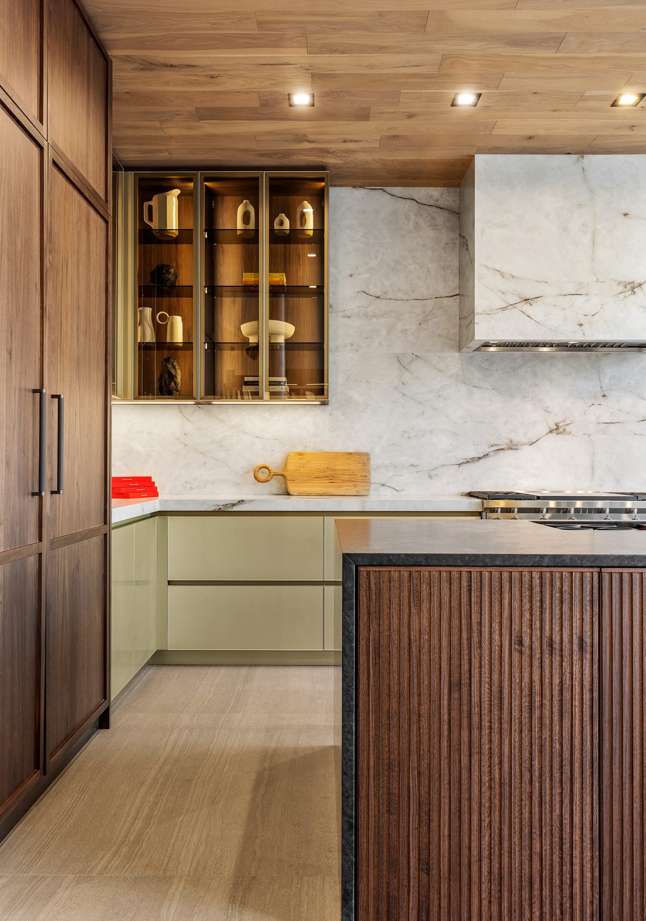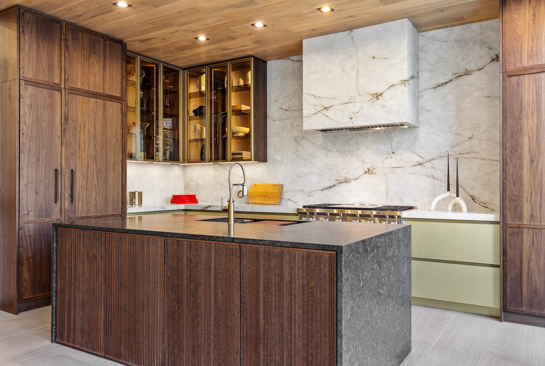 Contemporary kitchen with glass-front island